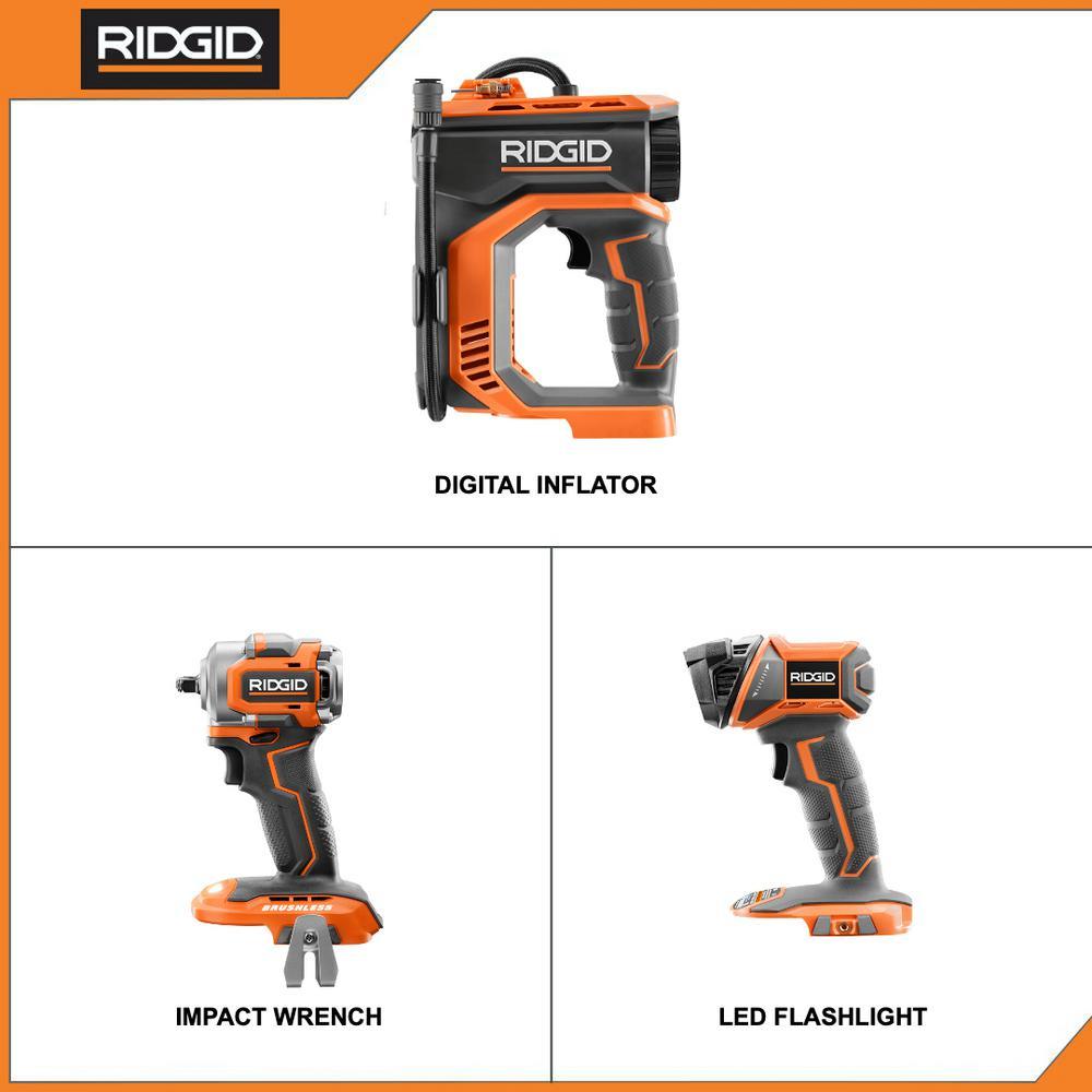 RIDGID introduces the 18-Volt Lithium-Ion Brushless Cordless 3/8 in. Impact Wrench, Torch Light, and High Pressure Inflator Kit (Tools Only). This 18-Volt SubCompact Brushless 3/8 in. Impact Wrench has 4-modes, including a unique auto-tightening mode, that helps it to stand out from the competition and makes it a must have in any shop. This SubCompact Brushless 3/8 in. Impact Wrench will relieve fatigue with 20% less weight and 25% more compact with its optimized ergonomics. The Brushless Motor offers more runtime and longer motor life. The RIDGID 18-Volt SubCompact Brushless lineup is 100% compatible with all RIDGID 18-Volt tools and batteries. The 18-Volt Torch Light puts out 340 Lumens using a lifetime LED light, so the light will never have to be replaced for the lifetime of the tool. The Digital Inflator provides the fastest truck tire fill from flat to full on the market. This tool is backed by the Industry's Only Lifetime Service Agreement, simply register within 90-days of purchase for FREE Parts, FREE Service, For LIFE. The 18-Volt 3-Tool Combo Kit includes an 18-Volt SubCompact Brushless Cordless 3/8 in. Impact Wrench with belt clip, an 18-Volt Digital Inflator with 12-Volt Vehicle Power Cord, Quick Coupler Chuck, Ball Inflation Needle, Brass Presta Chuck, Inflator Nozzle, an 18-Volt Torch Light, and an operator's manual. Battery and charger sold separately.
