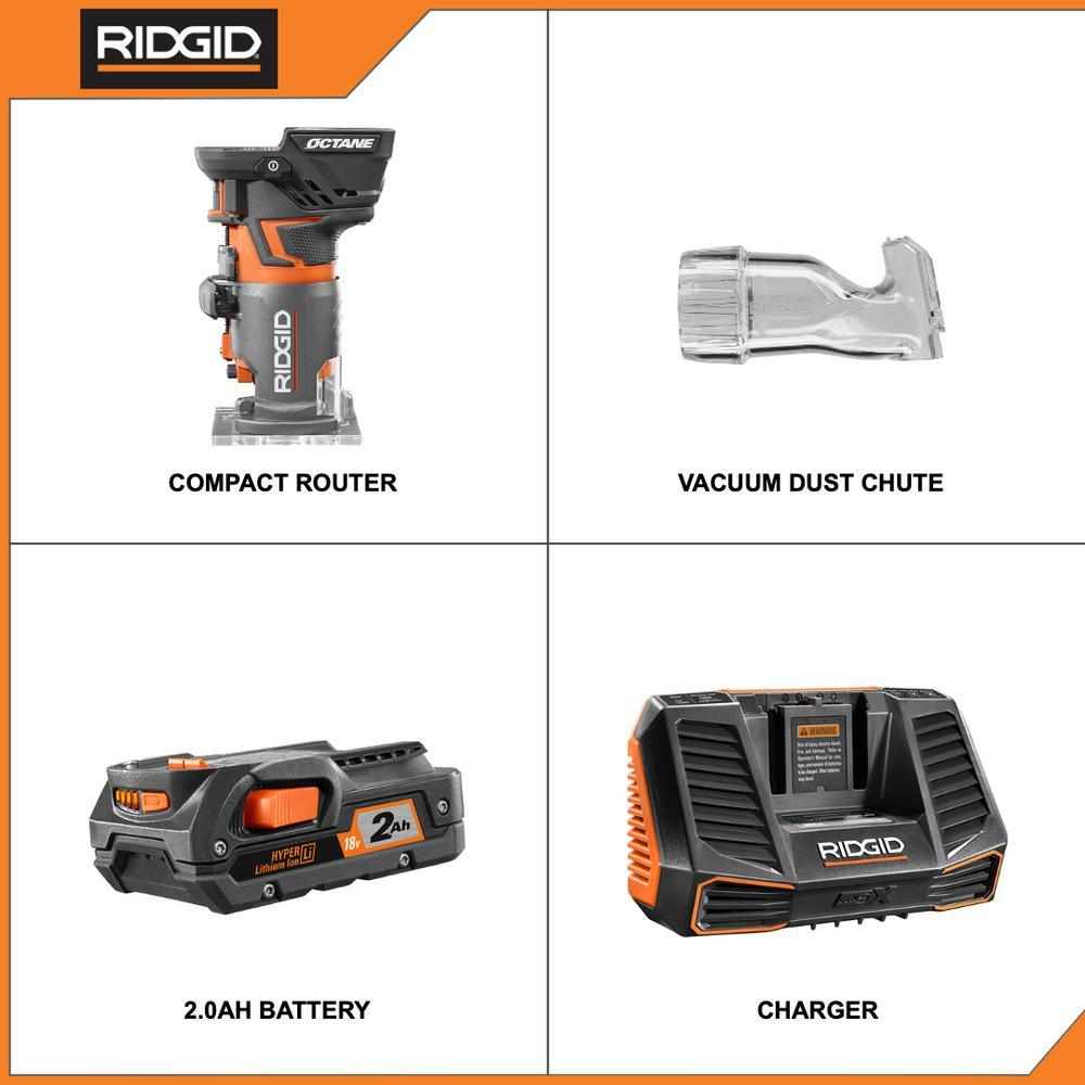 RIDGID introduces the 18-Volt OCTANE Cordless Brushless Compact Fixed Base Router with 18-Volt Lithium-Ion 2.0 Ah Battery Pack and Charger Kit. The OCTANE Brushless Compact Router features high performance brushless motors and advanced electronics that provide best-in-class power and intelligence. While providing increased performance with all RIDGID 18-Volt batteries, OCTANE tools provide maximum performance in high demand applications when paired with OCTANE batteries (not included). Paired with an OCTANE battery (not included), this tool delivers up to 15% more power than the previous model, making it perfect for DIY jobs around the house and for professionals. The 18-Volt Charger features Rapid Charge Time, Smart Charging, Cold/Hot Warning, and Energy Save Mode. The 2.0 Ah battery gives users prolonged run time and more charges over its lifetime compared to standard lithium-ion batteries. With registration, this tool is backed by the Industry's Only Lifetime Service Agreement: FREE Parts. FREE Service. For LIFE. The 18-Volt OCTANE Cordless Brushless Compact Router Kit includes a square and a round base, a detachable dust port, an edge guide, a 1/4 in. bit, a collet wrench, a 2.0 Ah Lithium-Ion Battery, an 18-Volt Charger, and an operator’s manual.
