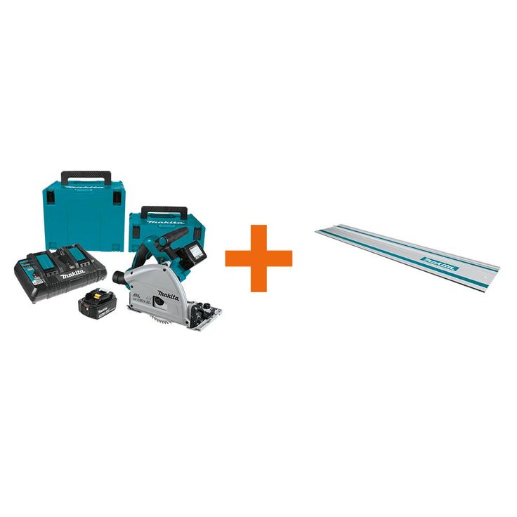 The Makita 18V X2 (36V) LXT Brushless 6-1/2 in. Plunge Circular Saw Kit (XPS01PTJ) delivers precise and more accurate cutting when combined with an optional guide rail system (sold separately). The saw and rail system work together to produce accurate cuts with minimal tear-out. The saw combines a powerful Makita-built brushless motor powered by two 18V LXT batteries with Automatic Speed Change Technology, which adjusts cutting speed and torque during the cut for optimum performance. The Saw has a variable speed control dial (2,500 - 6,300 RPM), with soft start and an electric brake for added convenience. It has a large 2-3/16 in. cutting capacity at 90 degrees, with a bevel capability of -1° to 48° and positive stops at 22.5° and 45°. When used with a rail system (sold separately) the Plunge Circular Saw is a more portable option to a table saw for select applications and is ideal for use on the job site or in a workshop. This Promotion also comes with a bonus 199140-0 39 in. Guide Rail.