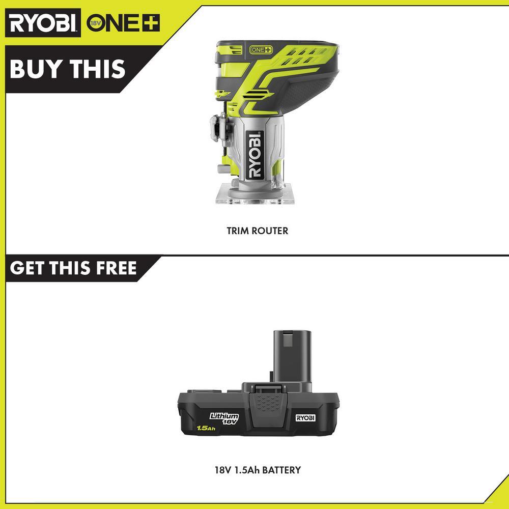RYOBI introduces the 18-Volt ONE+ Cordless Fixed Base Trim Route with 1.5 Ah Compact Lithium-Ion Battery. This Trim Router allows the user to create the perfect edge with the correct router bit and optional woodworking base. With 29,000 RPM, you can trim quickly and efficiently. The router features a compact design for fine routing. The included battery features lithium-ion cells, providing the user with over 50% more runtime compared to the (P102) 18-Volt ONE+ Lithium-Ion 1.3 Ah Compact Battery. Featuring Extreme Weather Performance, this battery can withstand frigid weather conditions and is engineered to deliver fade-free power for maximum performance. Best of all, it is part of the RYOBI ONE+ System of over 175 cordless tools that all work on the same battery platform. Backed by the RYOBI 3-Year Manufacturer's Warranty, the Fixed Base Trim Router includes a collet wrench, an 18-Volt ONE+ 1.5 Ah Compact Lithium-Ion Battery, and an operator's manual. Charger sold separately.