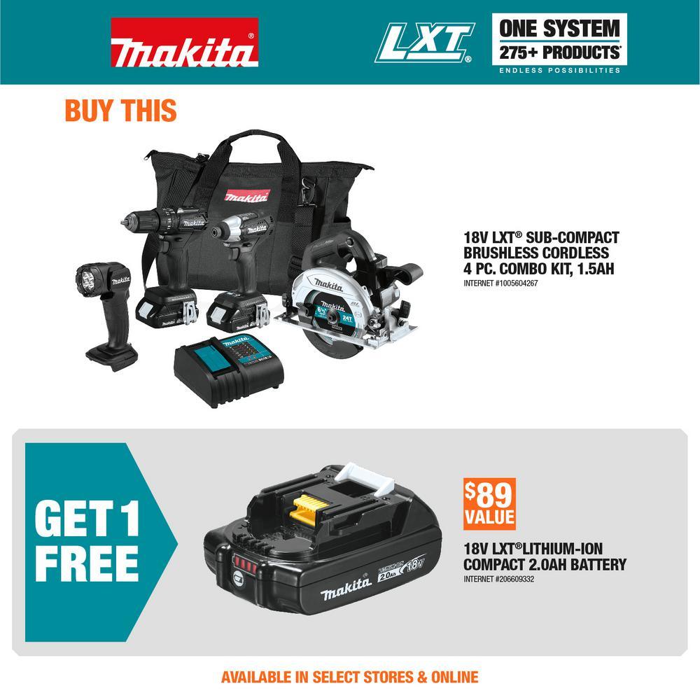 • Includes: 18V LXT Sub-Compact Brushless 1/2 in. Hammer Driver-Drill (XPH11ZB), 18V LXT Sub-Compact Brushless Impact Driver (XDT15ZB), 18V LXT Sub-Compact Brushless 6-1/2 in. Circular Saw (XSH04ZB), 18V LXT L.E.D. Flashlight (DML815B), 18V LXT Lithium-Ion Charger (DC18SD), 2 18V LXT Lithium-Ion 1.5Ah Battery, Tool Bag and a bonus 18V LXT Lithium-Ion Compact 2.0Ah Battery(BL1820B)