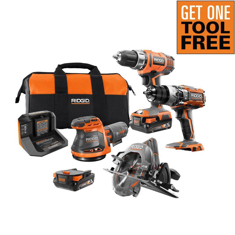 RIDGID introduces the 18V Lithium-Ion Cordless 3-Tool Combo Kit, (2) 2.0 Ah Lithium-Ion Batteries, Charger, Bag w/Hammer Drill/Driver. The 18V 2-Speed Drill/Driver Kit features all metal gears for added durability on the jobsite or at home. The 1/2 in. single sleeve ratcheting chuck holds bits tight and secure. Featuring innovative motor technology, the included sander maintains full speed and power under a heavy load. With a new ergonomic Hex Grip handle, this sander feels better than ever in your hand and runs for over 40 minutes on a 4.0 Ah Lithium-Ion Battery. With a 6-Speed variable speed dial this sander can run from 7,000-11,000 RPM. The 7-1/4 in. circular saw has an open frame motor that powers through the cut every time. The included 2.0 Ah batteries and charger are compatible with all RIDGID 18V Tools. The 18V Cordless 1/2 in. Hammer Drill/Driver provides Best-in-Class power, performance, and runtime. Backed by the Industry Leading Lifetime Service Agreement, this kit includes an 18V 1/2 in. Drill/Driver with a double-ended bit, an 18V 5 in. Random Orbit Sander with a dust bag, an 80 Grit Hook, a Loop Sandpaper, an 18V 7-1/4 in. Circular Saw with blade, two 2.0 Ah Lithium-Ion Batteries, an 18V Charger, an 18V 1/2 in Hammer Drill/Driver with belt hook, screw, and auxiliary handle, and operator's manuals.