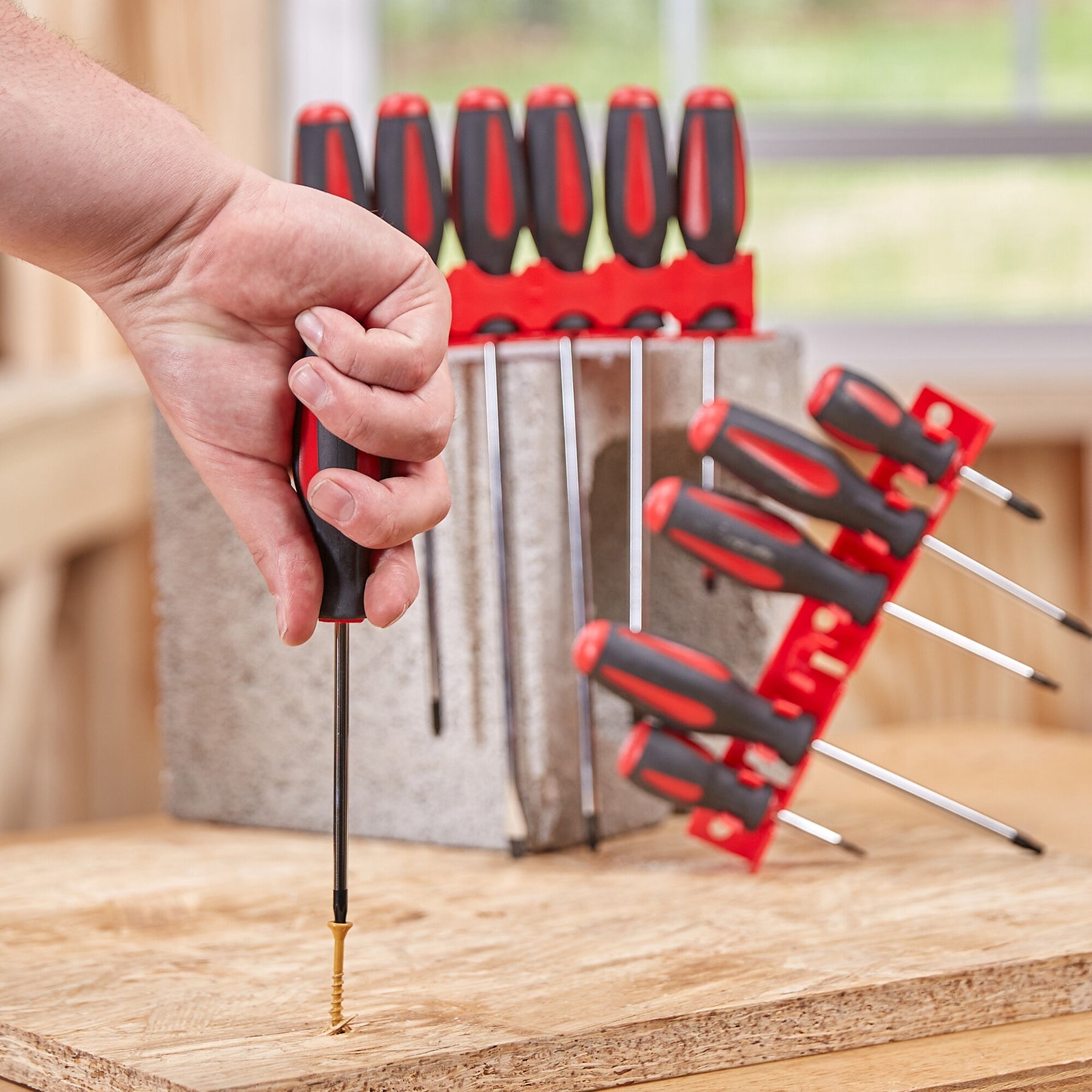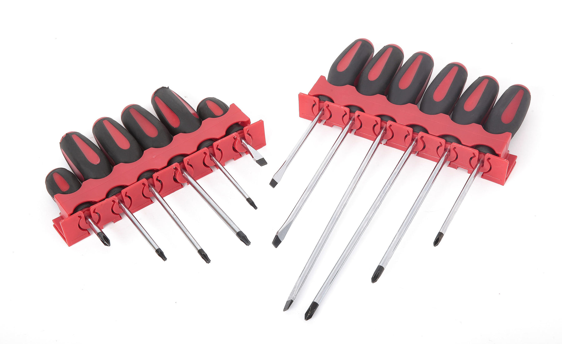 This streamlined screwdriver set brings order and utility to the workspace with bold red-and-black accents that feel modern and purposeful. The rubber handles and gleaming steel shafts create a balanced silhouette, while the clip-rail rack keeps tools artfully displayed and within reach. Style it on a wall-mounted pegboard or along a workbench for instant function and visual harmony. A smart, polished essential for a refined, hardworking home studio.