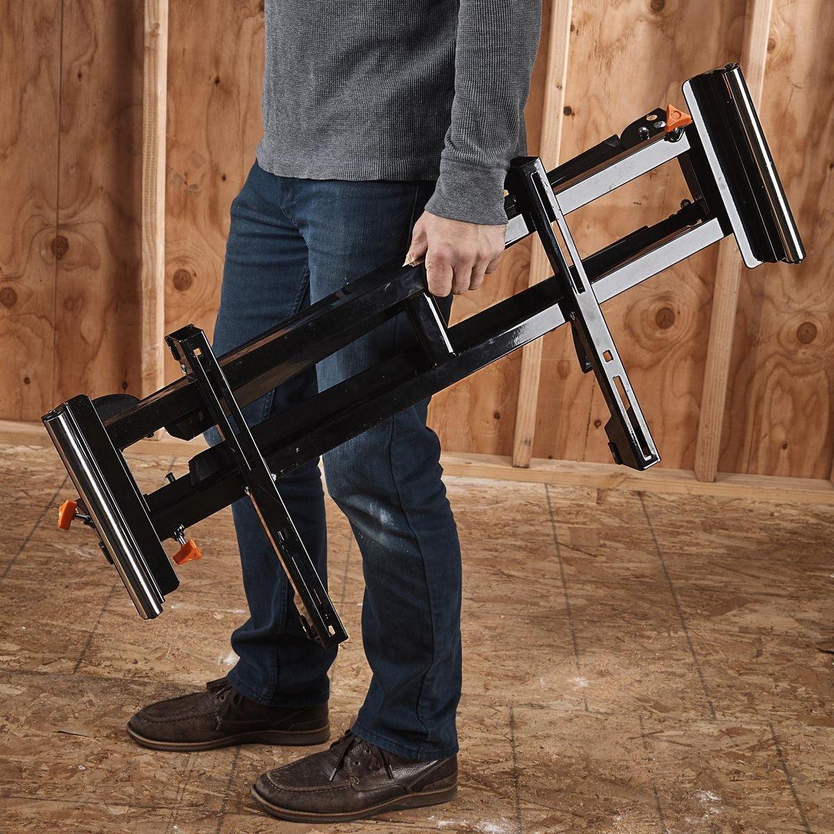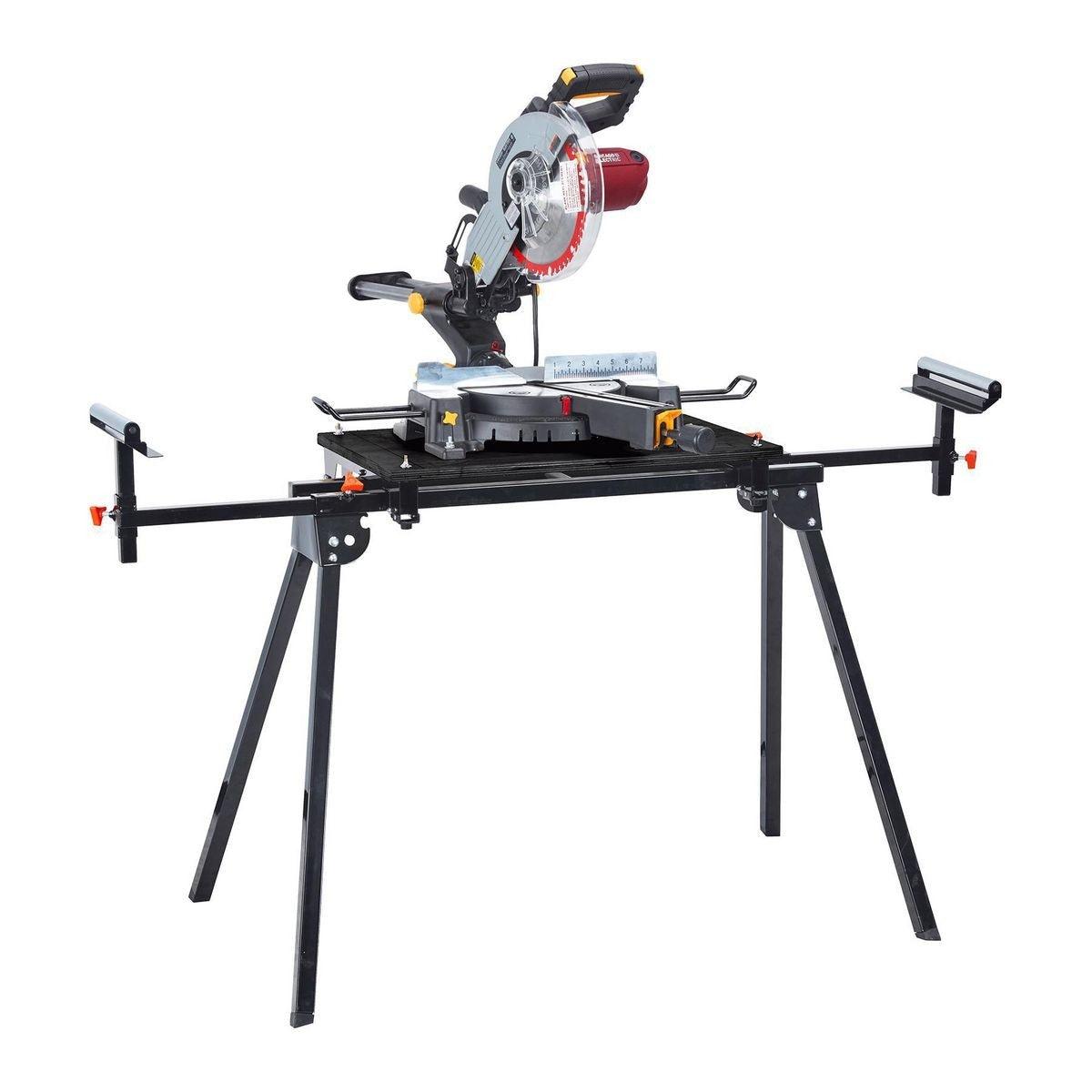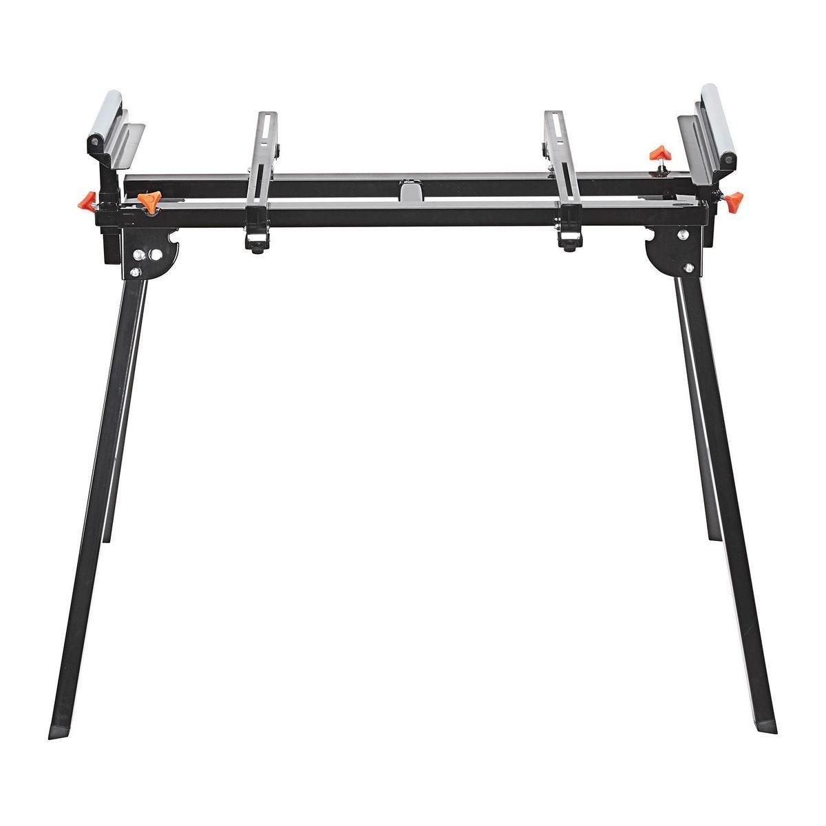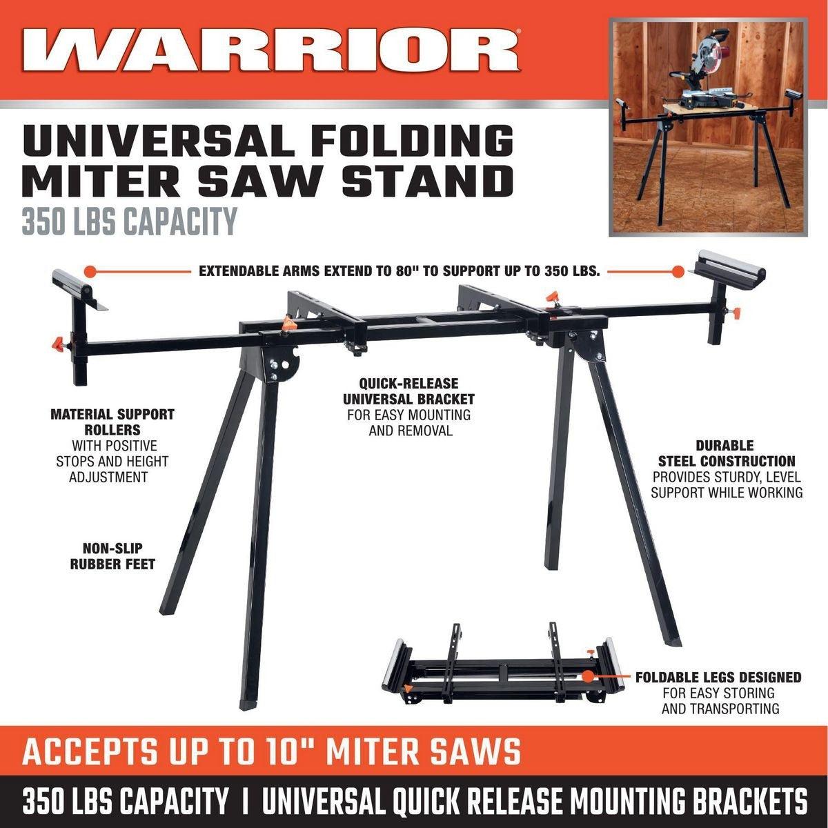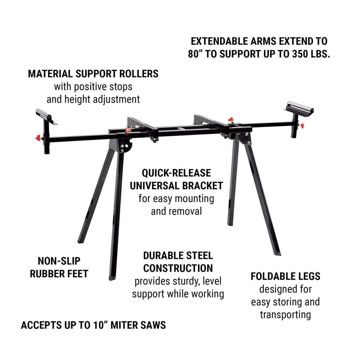 This foldable miter saw stand has a universal design compatible with all major miter saw brands. The Extendable arms support over 80 in. of material and up to 350 lb. Featuring durable steel construction provides sturdy, level support while working, convenient rollers for material support making cutting large pieces easy and foldable design for easy storing and transporting.