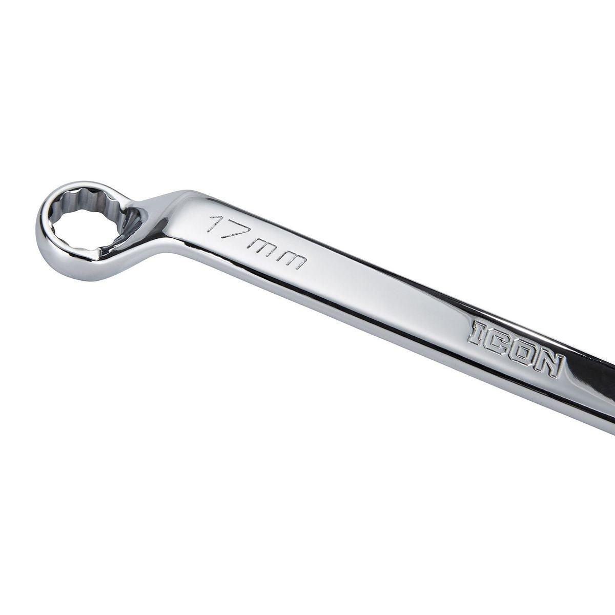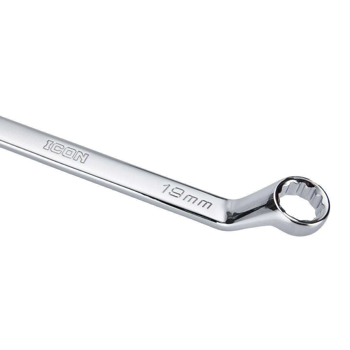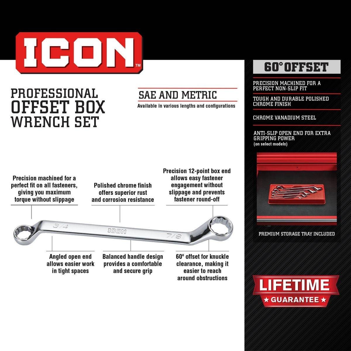 The Icon™ Professional Offset Box Wrench Set is precision-machined for a perfect non-slip grip, and features a 12-point box end for easy fastener engagement without slippage and prevents fastener round-off, resulting in more efficient work. We use a premium chrome vanadium steel, with a tough and durable polished chrome finish that offers superior rust and corrosion resistance and prevents grease build-up. The 60° offset for knuckle clearance makes it easier to reach around obstructions. Designed with comfort and efficiency in mind, the Icon™ Professional Offset Box Wrench Set offers a balanced handle design for a comfortable secure grip, and is backed by a hassle-free manufacturer's lifetime warranty.
