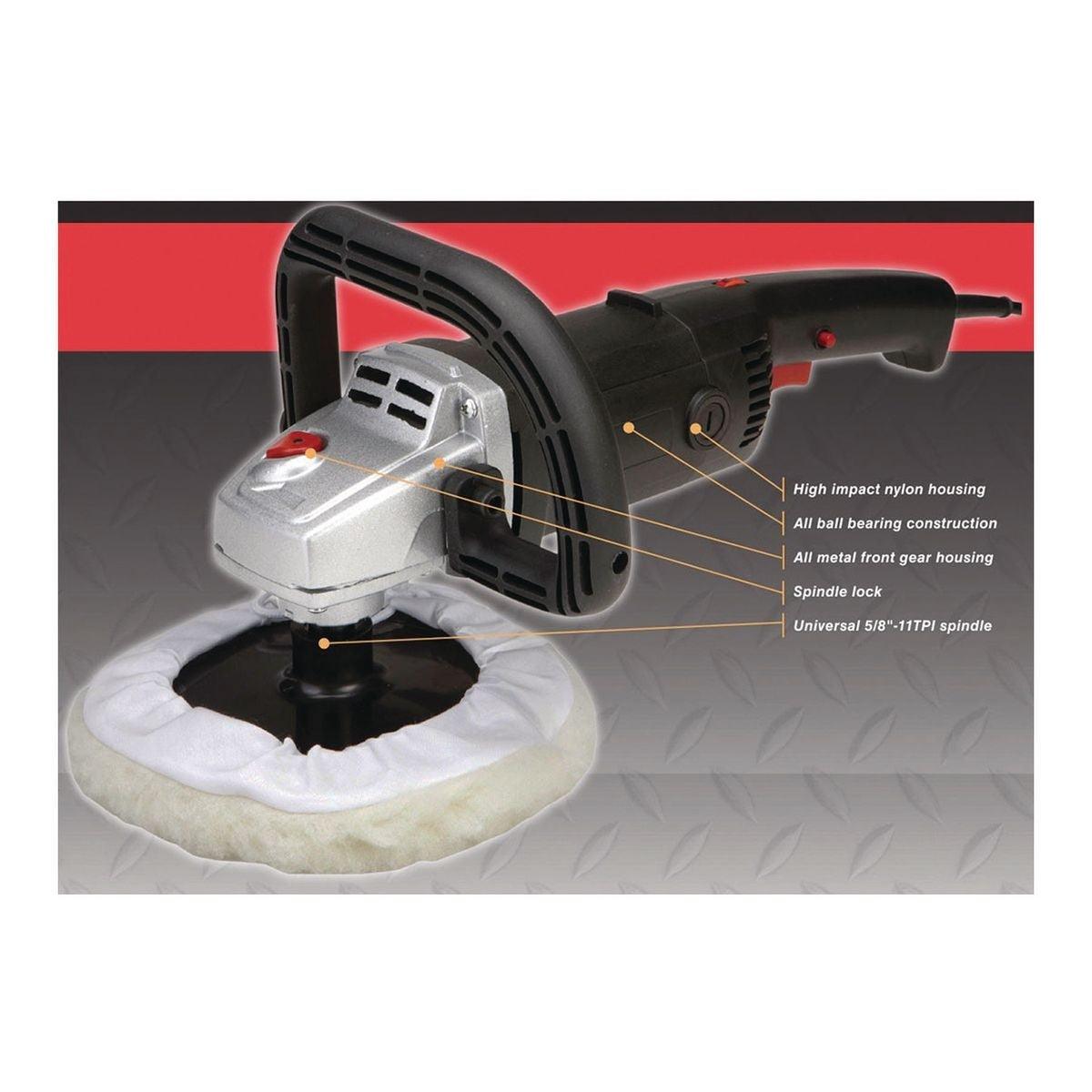 Versatile polisher/sander works in the 600 RPM to 3350 RPM range so you can easily polish your vehicle’s finish or sand all types of larger work surfaces. All ball-bearing construction helps this polisher/sander operate smoothly.