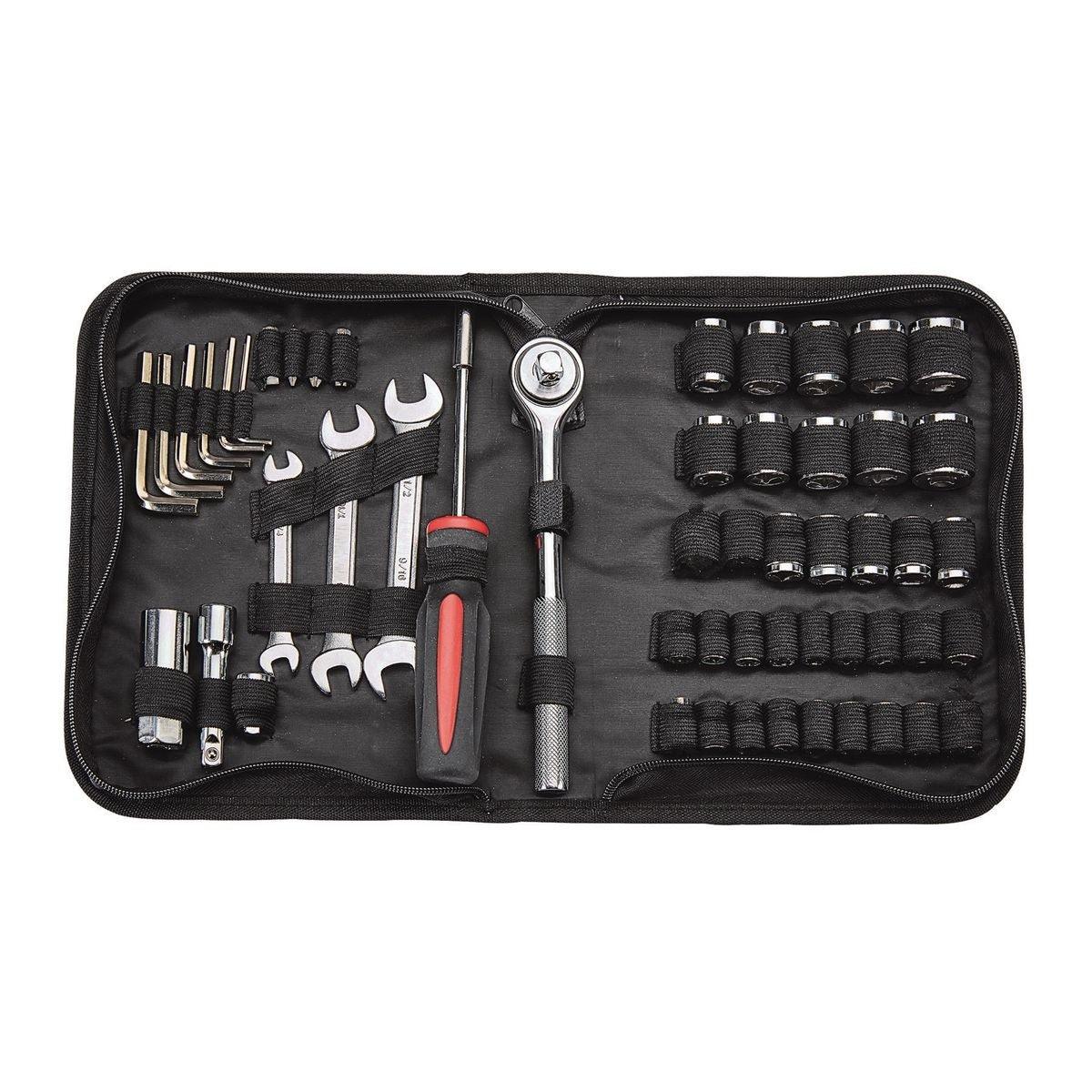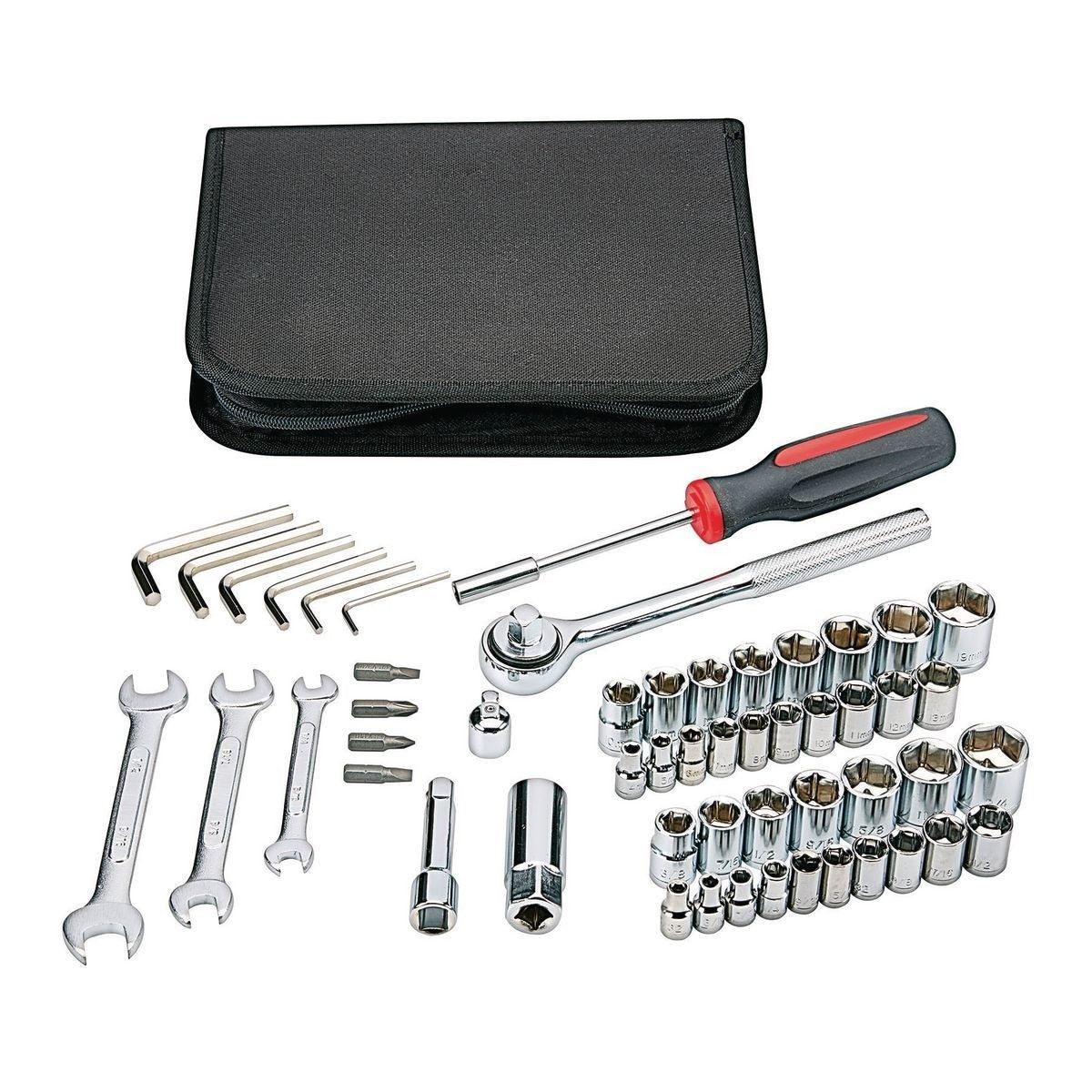 This handy tool kit of metric and SAE wrenches is the perfect size to stash in your car or truck. The heat-treated steel assortment comes with a durable tool bag for storage and portability and each socket is clearly marked for easy identification. The tool kit also includes Phillips and slotted drivers in popular sizes.