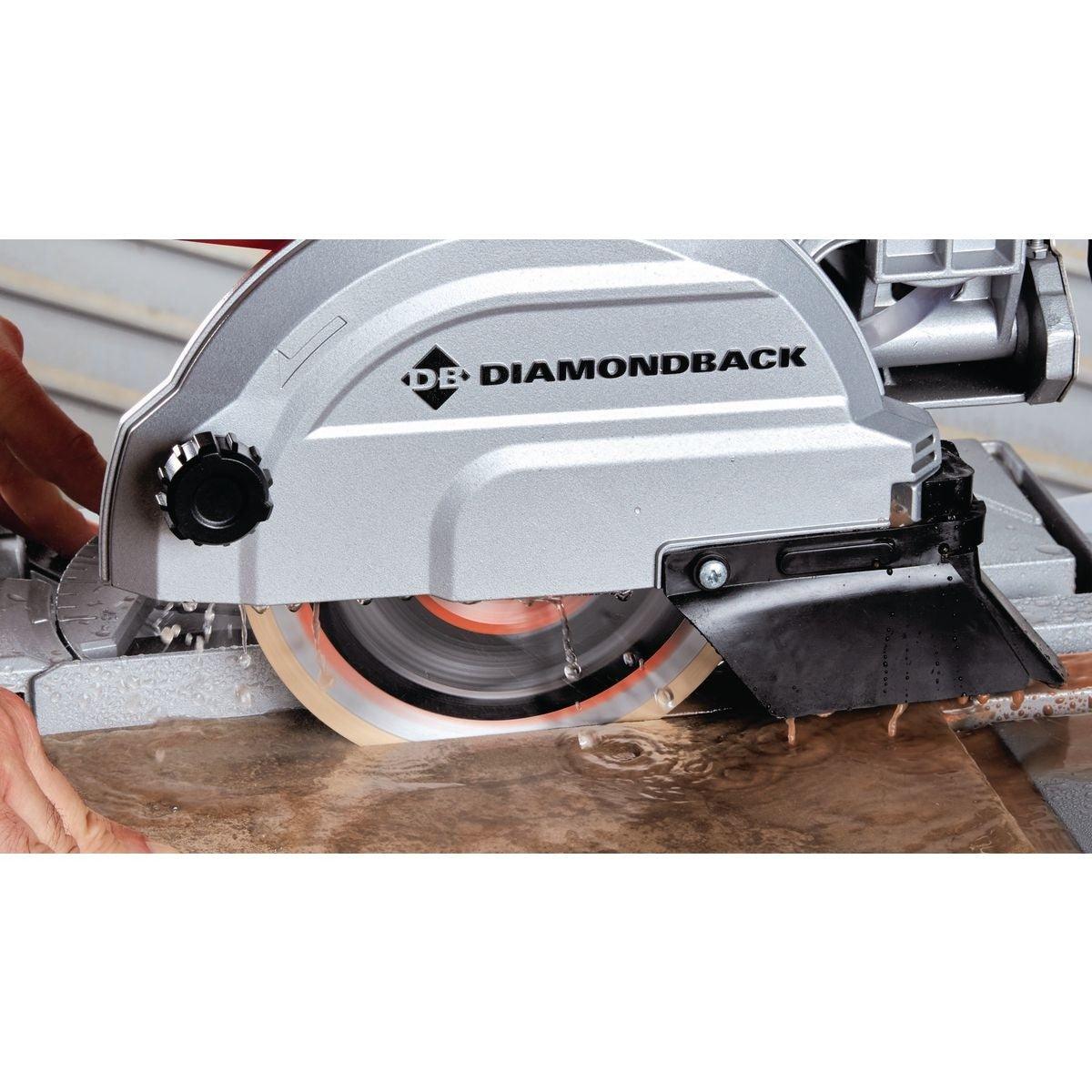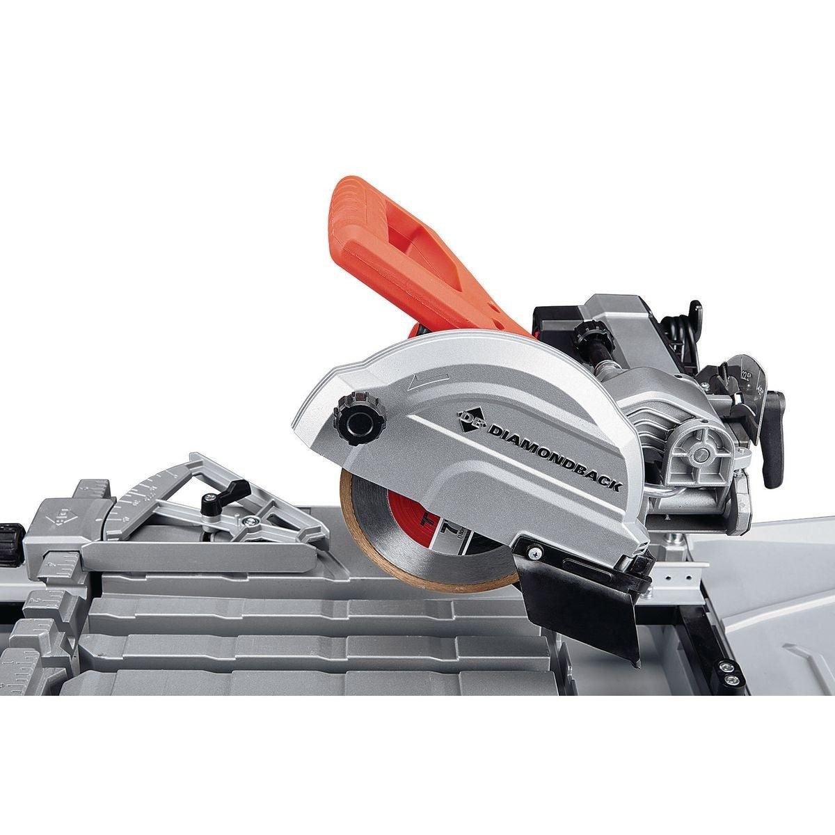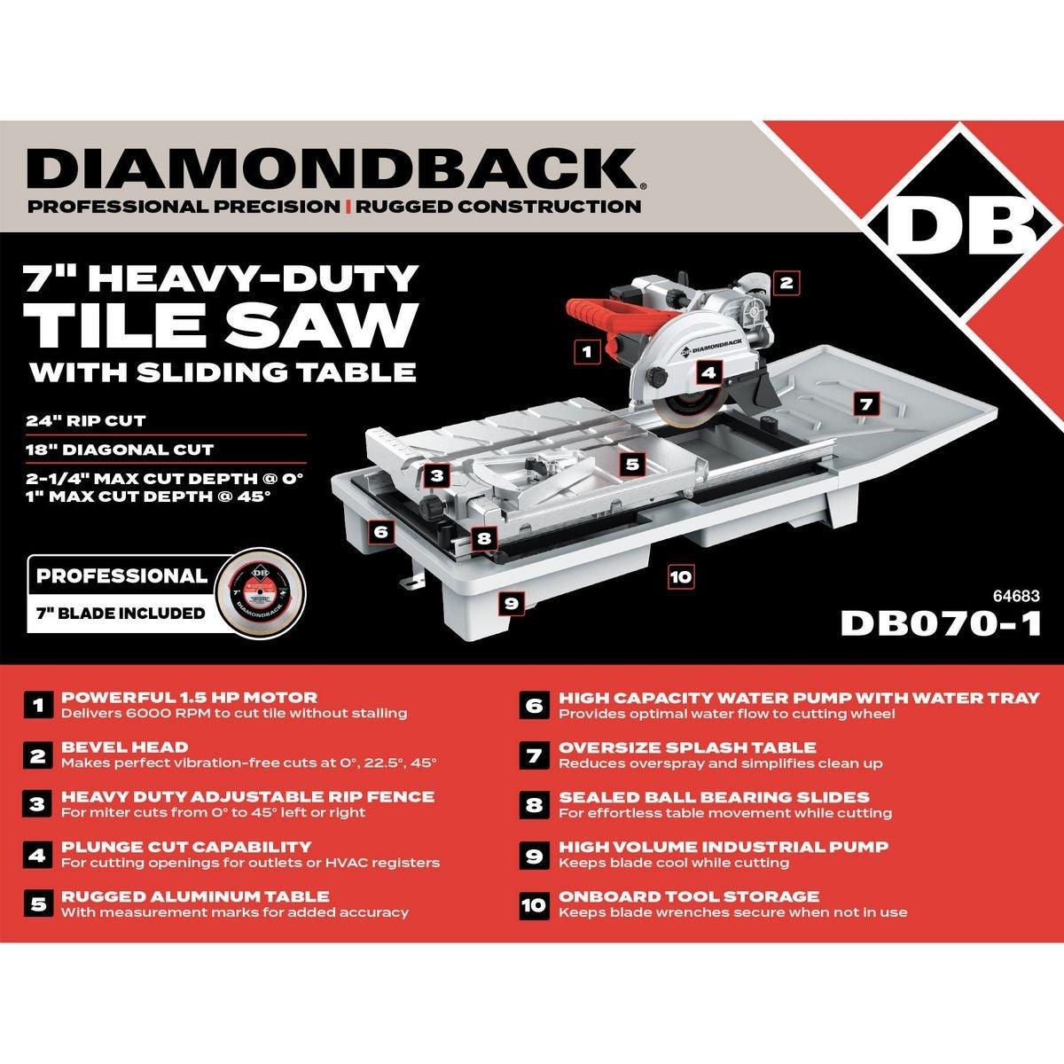 The Diamondback™ 7 in. Wet Tile saw was built with an impressive 1.5 HP delivering 6000 RPMcapable of powering through the toughest of porcelain, stone and masonry up to 2-1/4 in. thick all in a lightweight design. The non-slip sliding table with sealed ball bearings allow for a rip capacity of 24 in. and 18 in. on the diagonal. This saw also features oversized splash tables that contains cutting debris for easy cleanup. An efficient water management system with a high volume industrial water pump delivers optimum water flow to the blade for vibration and chip free cuts. Included Diamondback™ Professional 7 in. Blade.