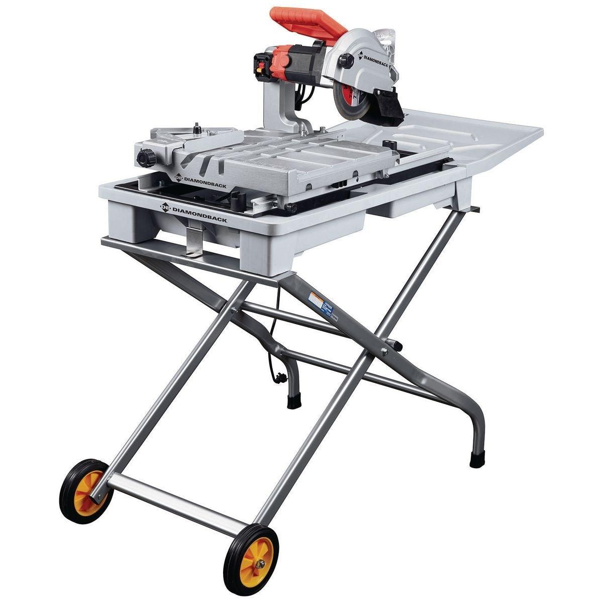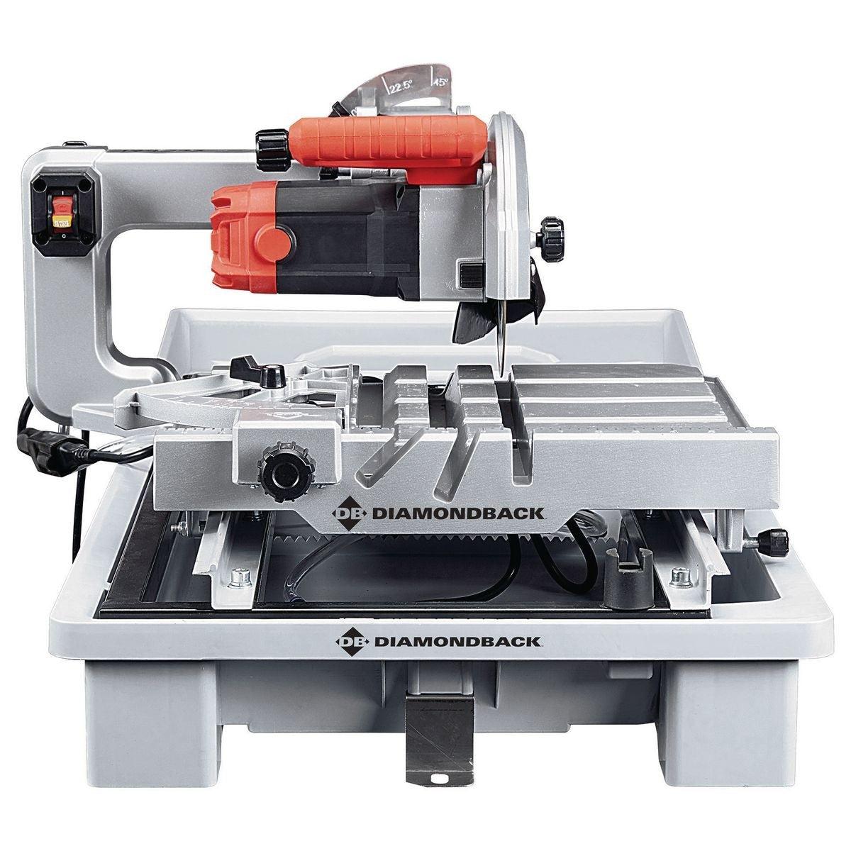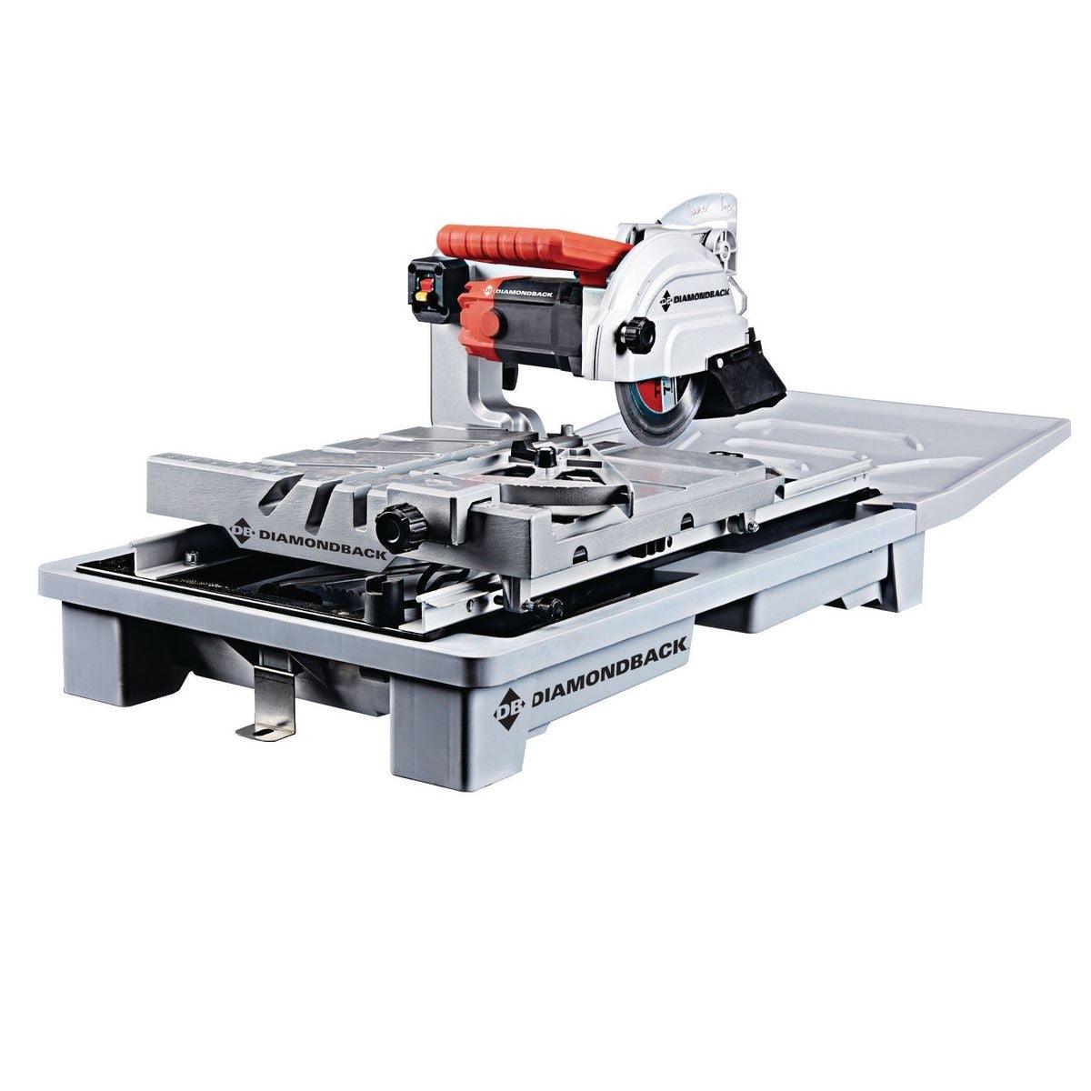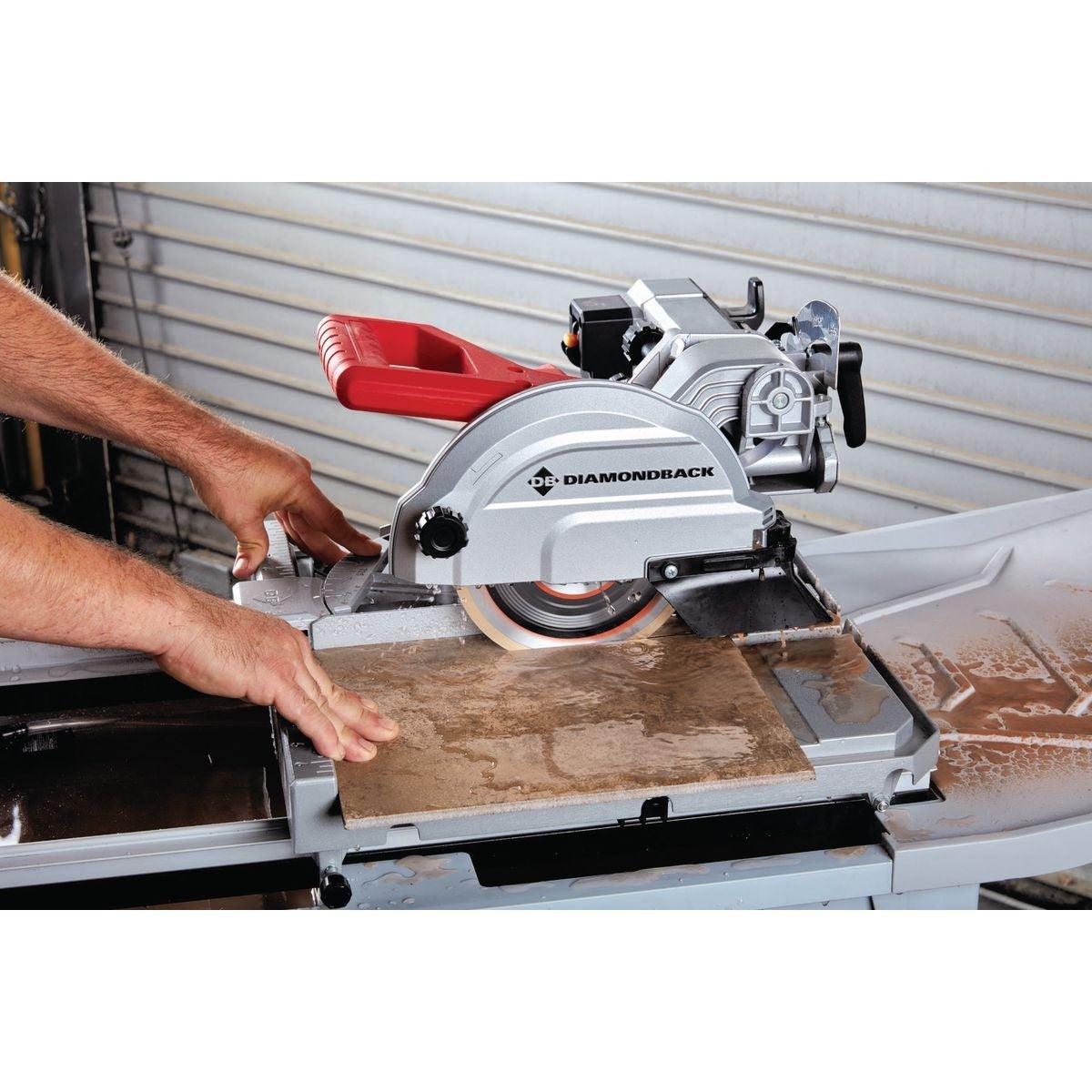 The Diamondback™ 7 in. Wet Tile saw was built with an impressive 1.5 HP delivering 6000 RPMcapable of powering through the toughest of porcelain, stone and masonry up to 2-1/4 in. thick all in a lightweight design. The non-slip sliding table with sealed ball bearings allow for a rip capacity of 24 in. and 18 in. on the diagonal. This saw also features oversized splash tables that contains cutting debris for easy cleanup. An efficient water management system with a high volume industrial water pump delivers optimum water flow to the blade for vibration and chip free cuts. Included Diamondback™ Professional 7 in. Blade.