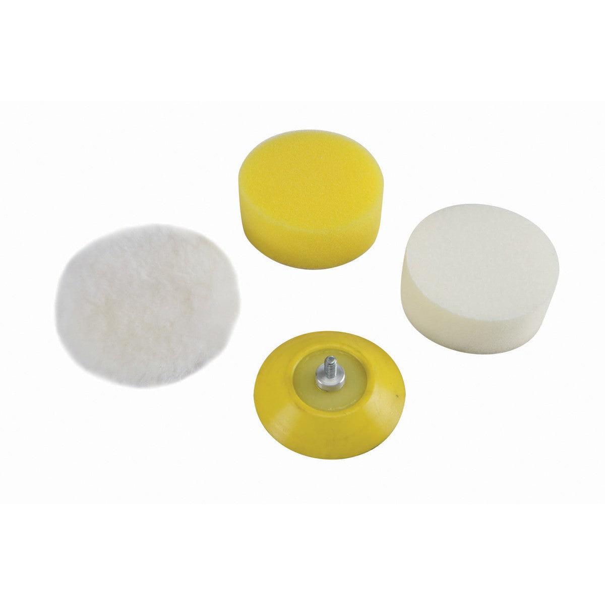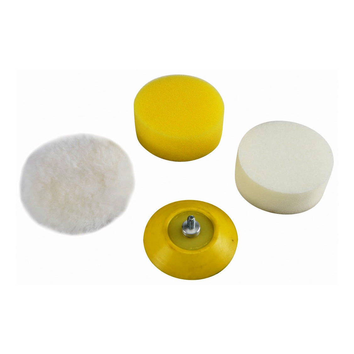 Compact 3-inch polishing and buffing kit for quick detail work on small surfaces. Includes foam pads, closed-cell pad, wool bonnet, and 1/4 in. shank backup pad for use with most 3 in. air polishers.