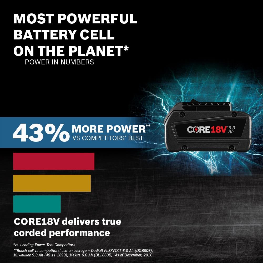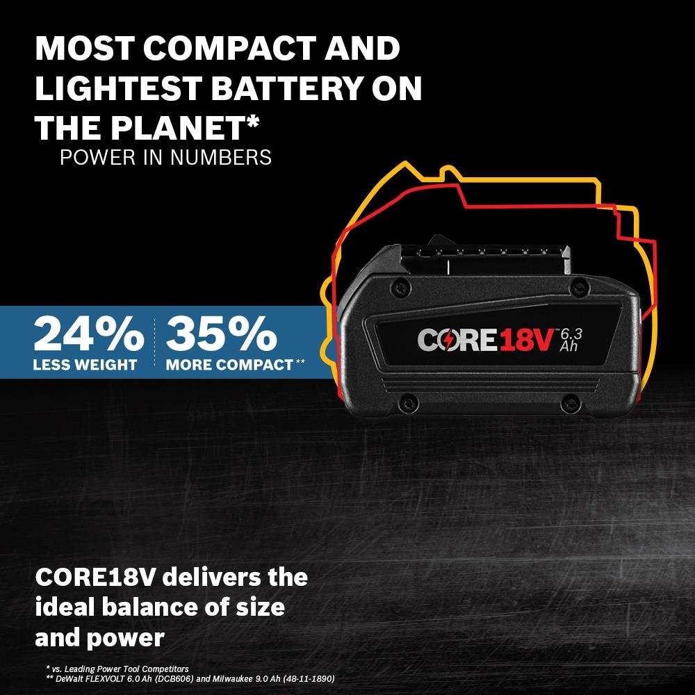 Kickstart your Bosch 18V system with a high-performance CORE18V 6.3Ah battery and BC1880 fast charger. Next‑gen lithium cells and CoolPack 2.0 deliver longer runtime, higher power, and extended battery life, all compatible with every Bosch 18V tool.