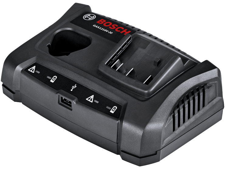 Charge Bosch 12V Max and 18V lithium-ion batteries with one compact dual-bay charger. The GAX1218V-30 adds a 2.1A USB port for phones and devices and features LED status indicators and automatic shut-off for efficient, safe charging.