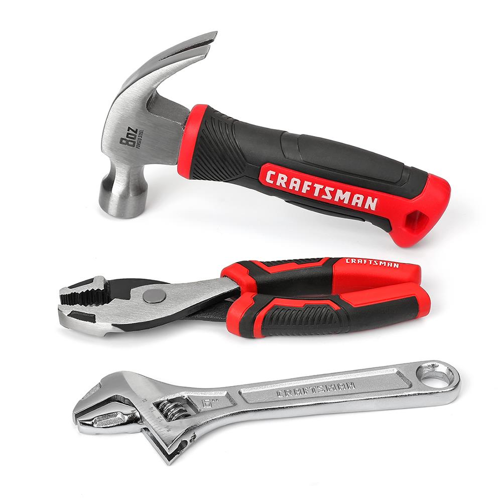 - Essential Starter Set: Includes pliers, adjustable wrench, stubby 8-oz claw hammer, Phillips and slotted screwdrivers, safety scissors, 12-ft tape measure, and 10-1/2 in. tool bag