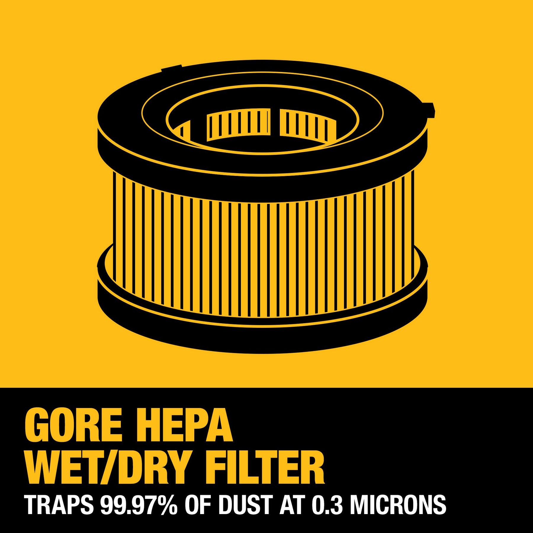 • HEPA Filtration: GORE HEPA wet/dry filter captures 99.97% of dust down to 0.3 microns and is washable.