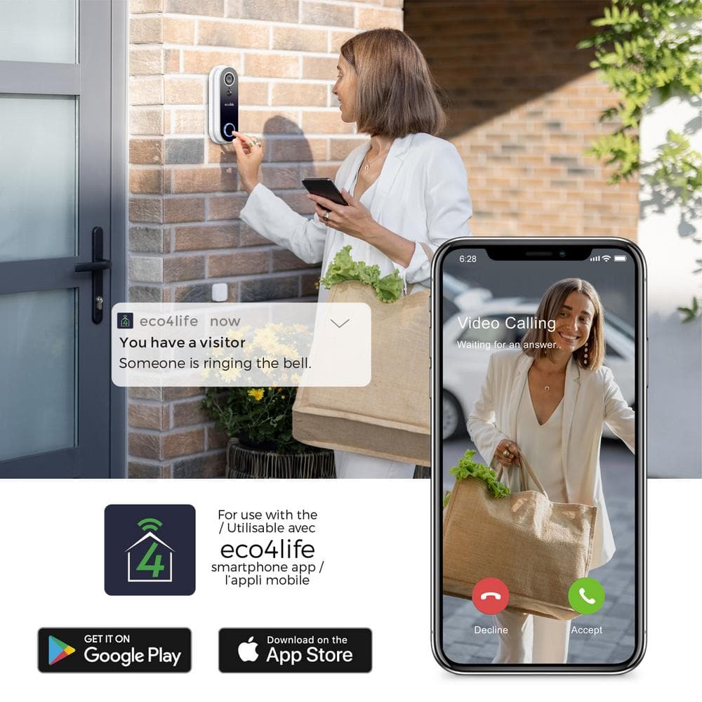 ECO4LIFE Video Doorbell - Smart Wireless WiFi Doorbell Camera with Built-in Battery, 2-Way Talk, Night Vision, White