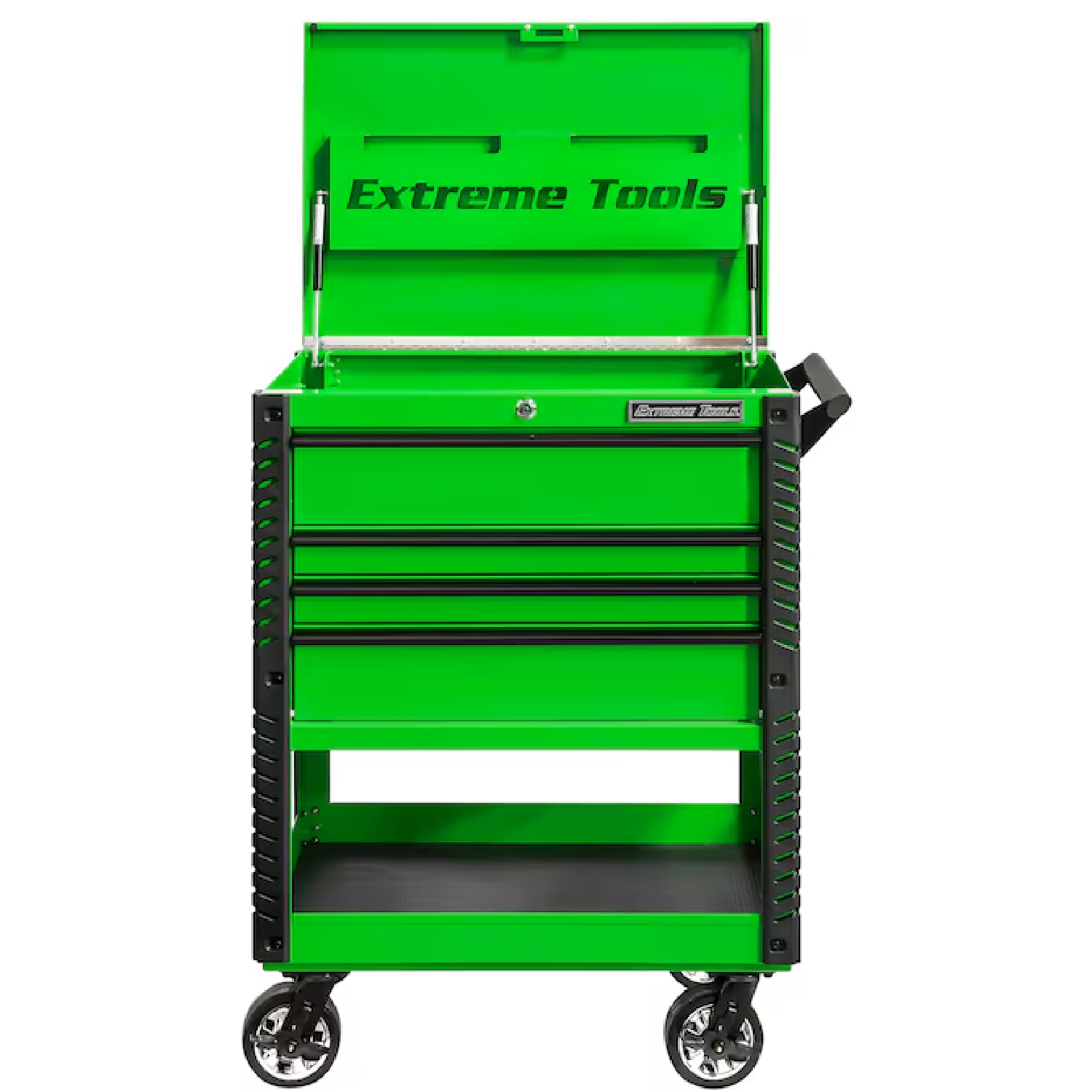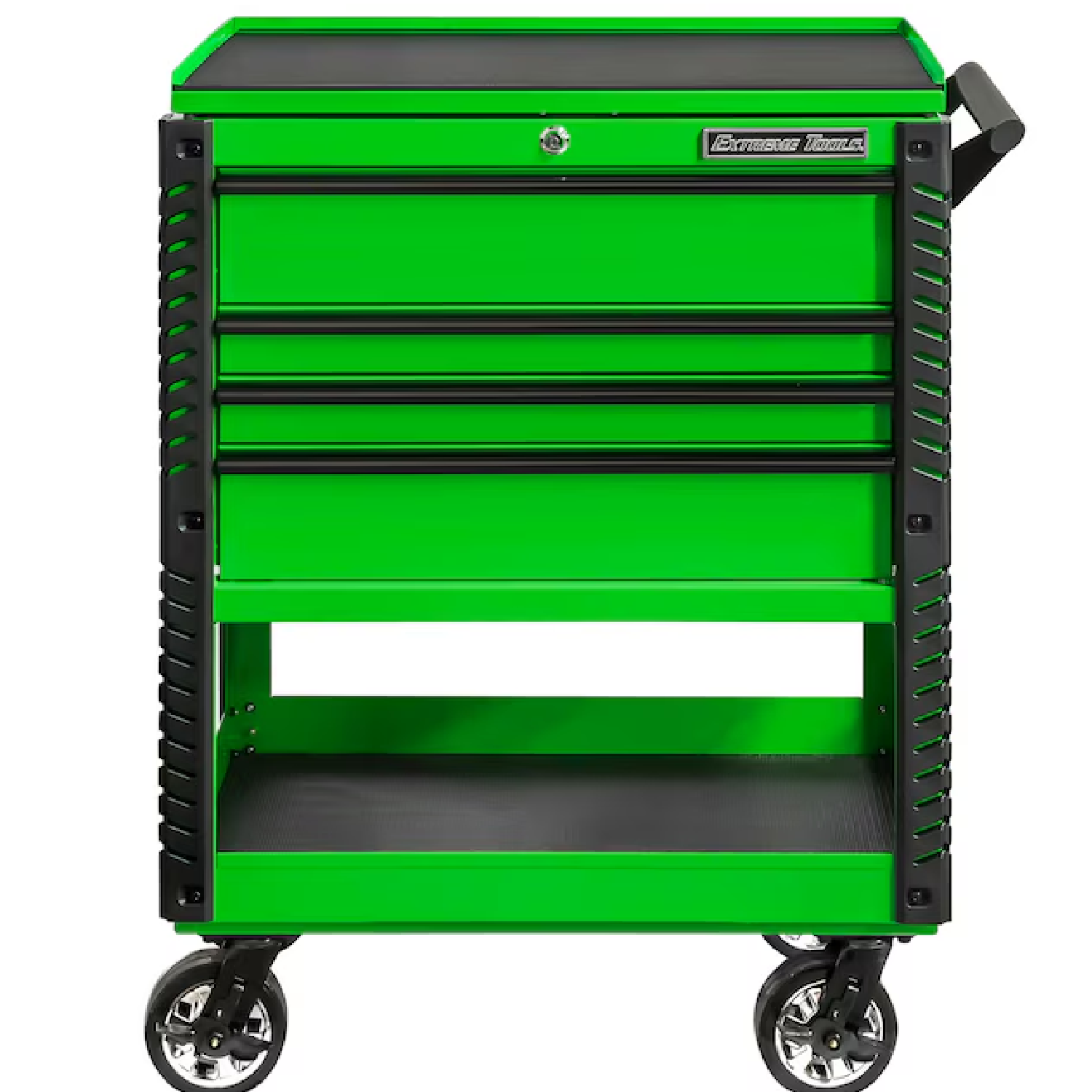 Discover the ultimate solution for your tool storage needs with the Extreme Tools EX 33-in W x 44.25-in H 4-Drawer Steel Rolling Tool Cabinet. Engineered for durability and ease of use, this vibrant green tool cabinet keeps your tools organized and accessible, enhancing your productivity and workspace efficiency.