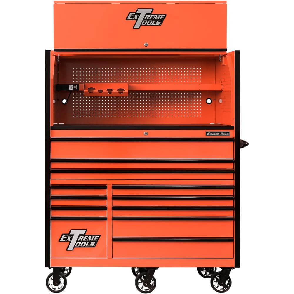 Extreme Tools RX Professional 55 in. W x 25 in. D 12-Drawer Roller Cabinet and Top Hutch Combo in Orange with Black Drawer Pulls