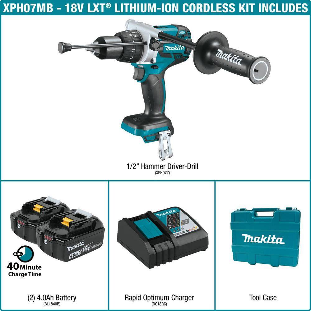 Makita 18-Volt LXT Brushless 1/2 in. Cordless Hammer Drill Kit with (2) 4.0Ah Batteries, Rapid Charger and Hard Case (XPH07MB)