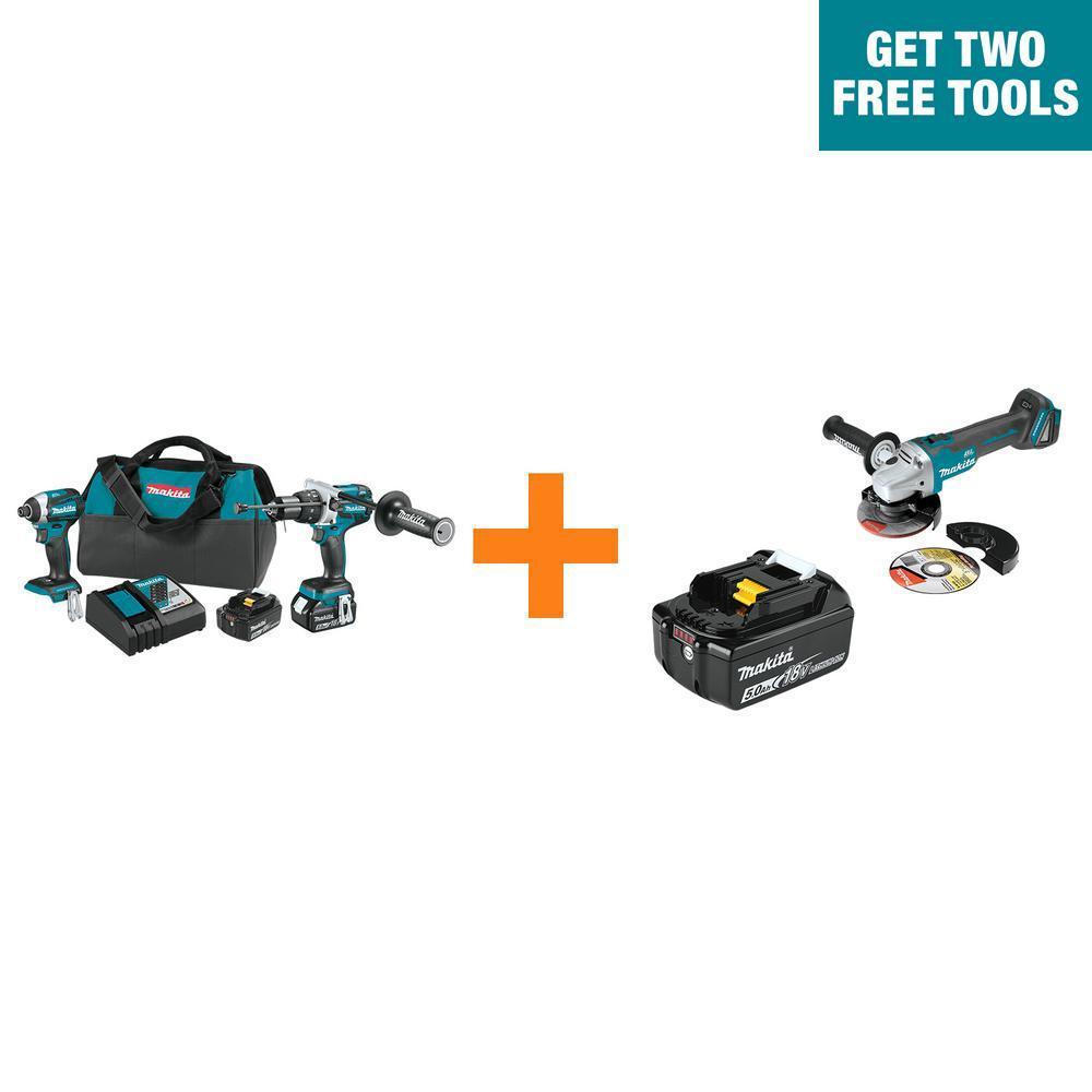 Makita 18V LXT Brushless 2‑Pc Combo Kit (XT268T) 5.0Ah with Bonus 18V LXT 5.0Ah Battery and 18V LXT Brushless Cut‑Off/Angle Grinder