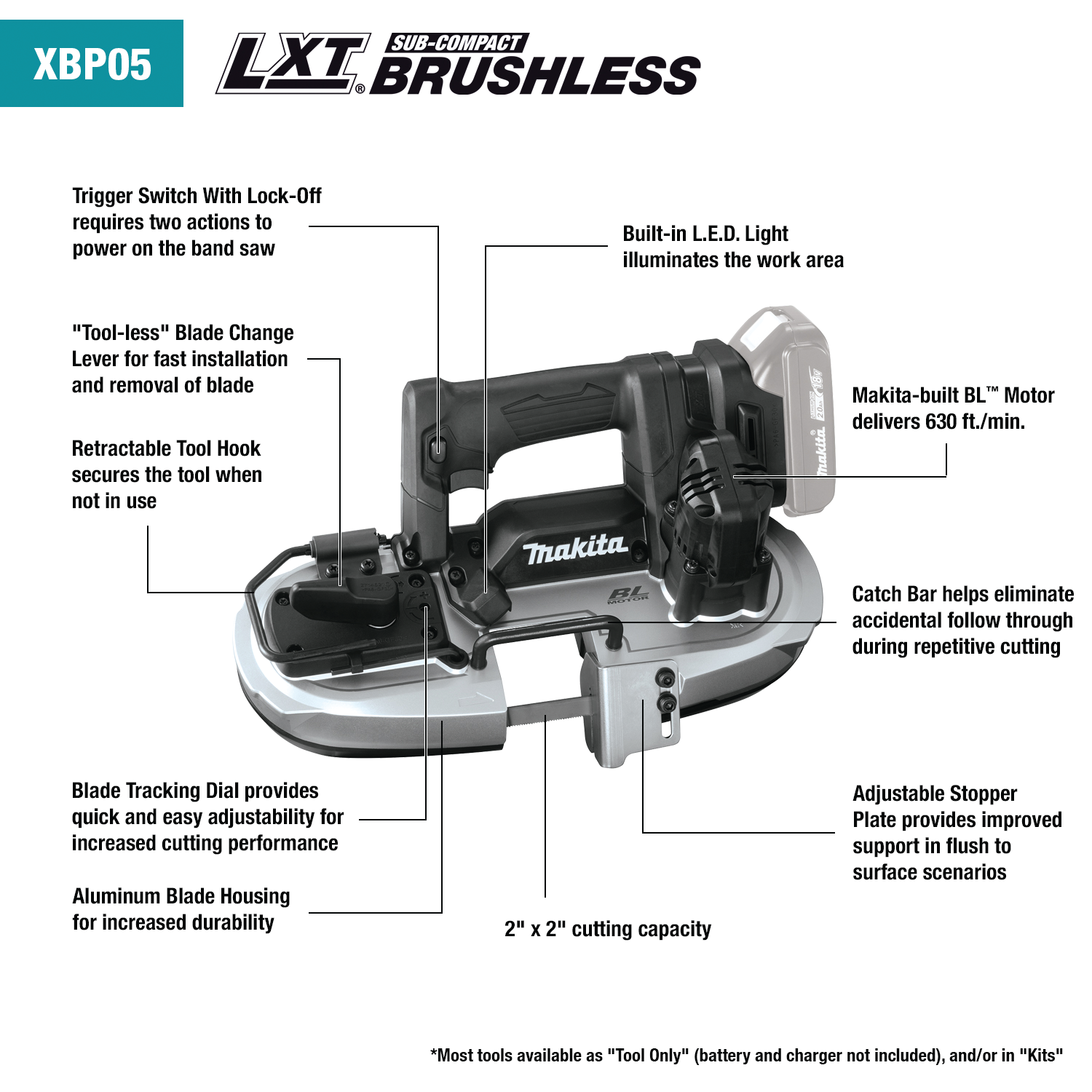 Makita 18V LXT Lithium‑Ion Sub‑Compact Brushless Cordless Band Saw, Tool‑Only (XBP05ZB)