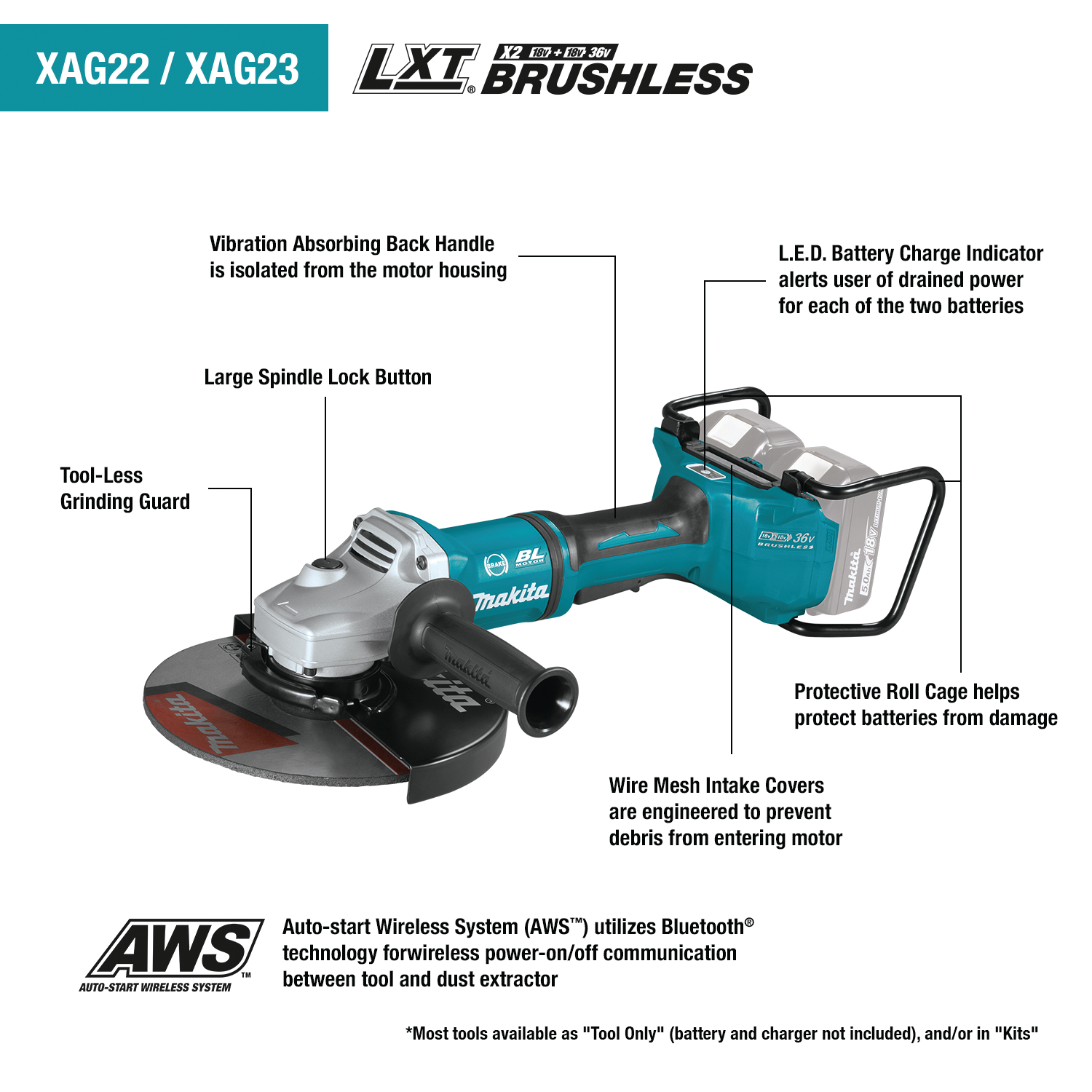 Power through heavy-duty cutting and grinding with Makita’s 18V X2 LXT (36V) Brushless 9-inch grinder. It features an electric brake, AWS Bluetooth connectivity to dust extractors, and advanced safety tech for corded-like performance without the cord.