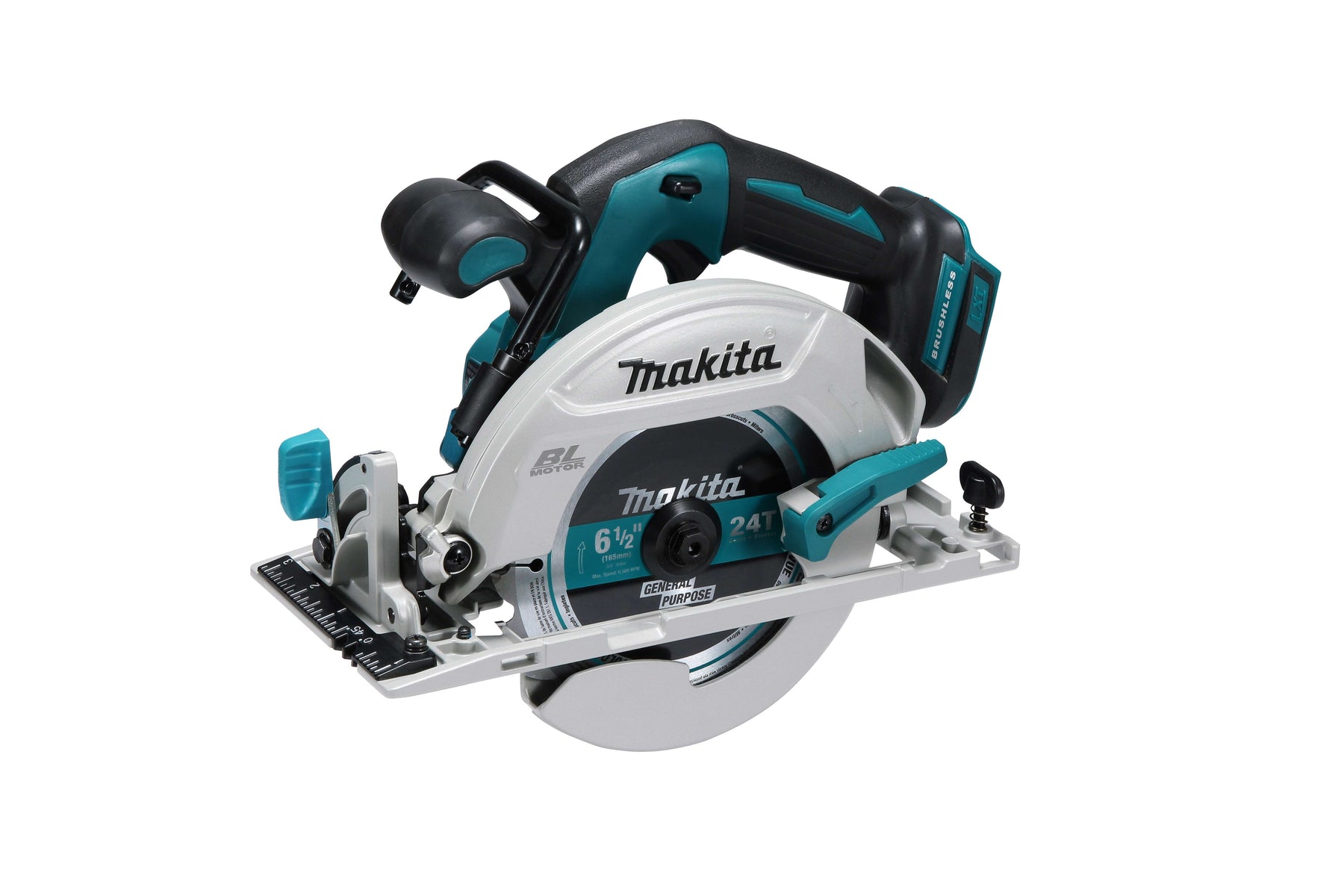 This Makita 18V LXT brushless 6-1/2 in. circular saw delivers 5,000 RPM cutting performance without the cord. A magnesium base and guards keep it light yet durable, while Automatic Speed Change technology optimizes torque for clean, fast cuts on the jobsite.