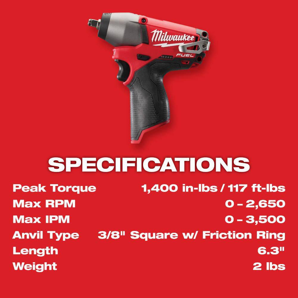 • Compact 3/8 in. Impact Wrench: 1,400 in-lbs torque, 0–2,650 RPM and 0–3,500 IPM with 2-Mode Drive Control.