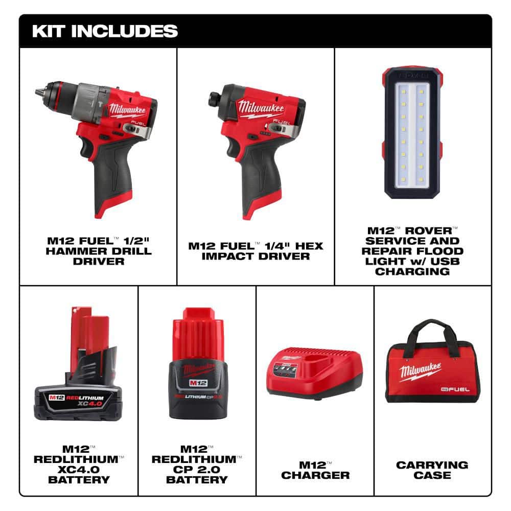 Milwaukee M12 FUEL 12-Volt Lithium-Ion Brushless Cordless Hammer Drill & Impact Driver Combo Kit with M12 ROVER Service Light