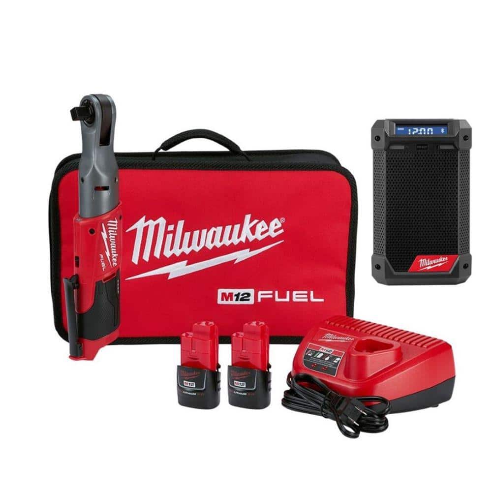 Milwaukee M12 FUEL 12V Brushless Cordless 1/2 in. Ratchet Kit with M12 Bluetooth AM/FM Jobsite Radio and Charger