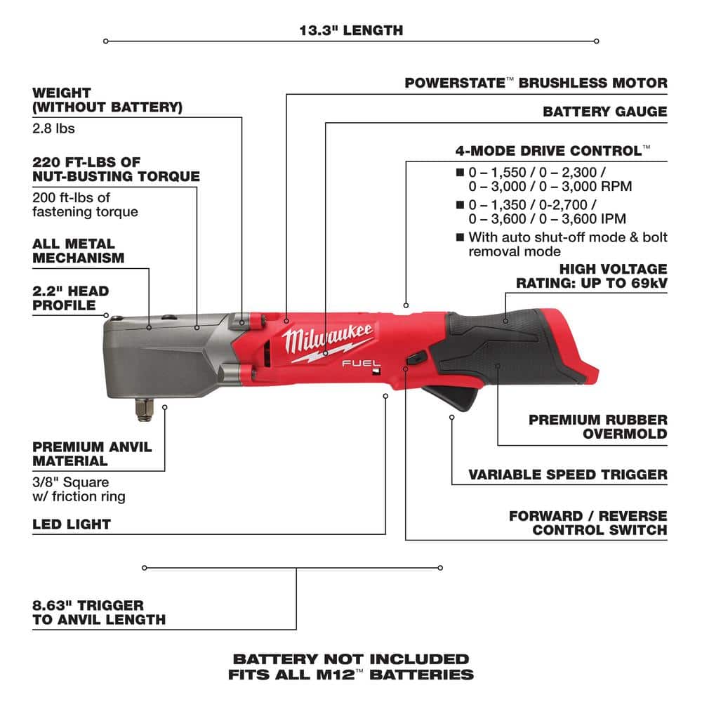Milwaukee M12 FUEL 12V Lithium‑Ion Brushless Cordless 3/8 in. Right Angle Impact Wrench (Tool‑Only)