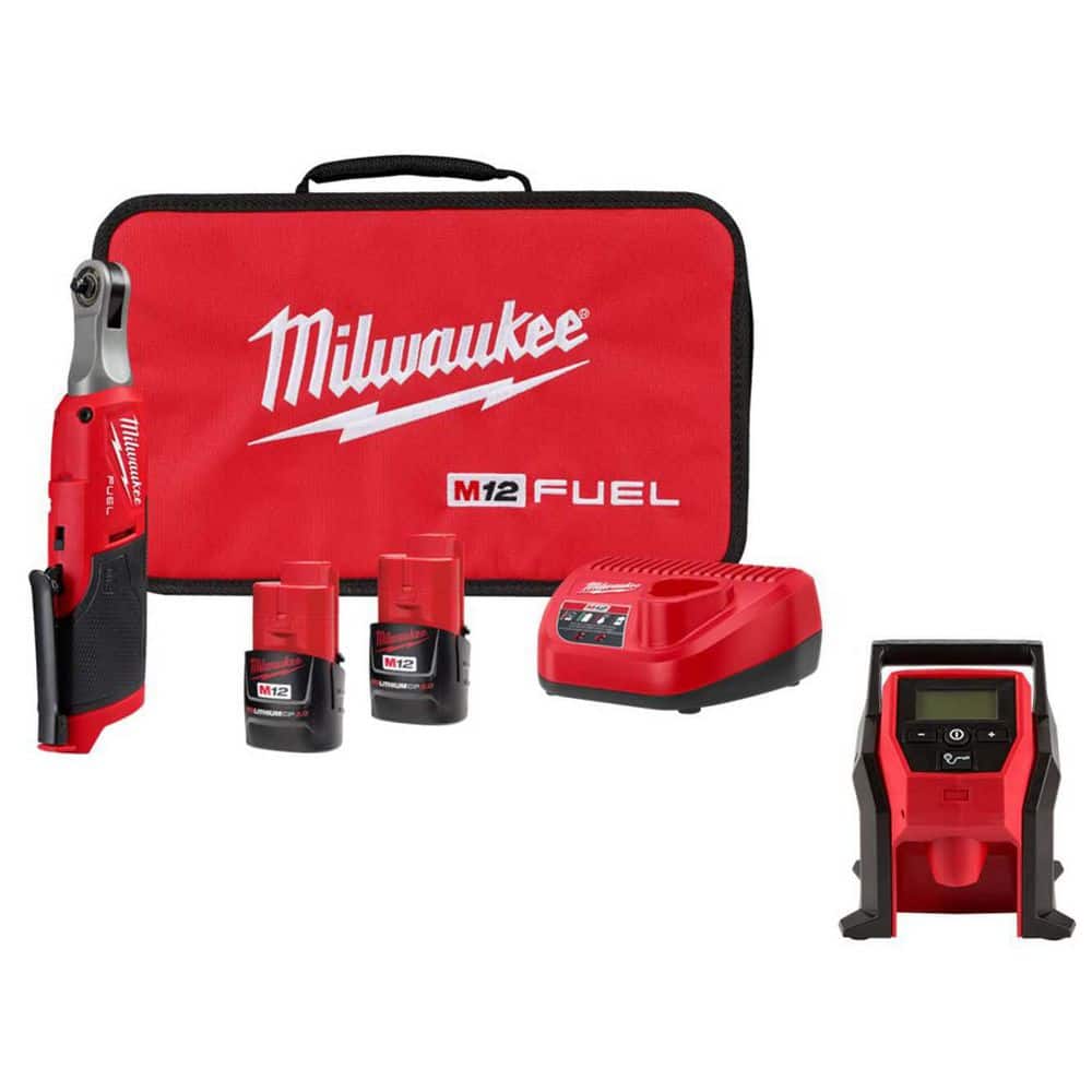 Milwaukee M12 FUEL 12V Lithium-Ion Brushless High-Speed 1/4 in. Ratchet Kit with M12 Compact Inflator (2566-22-2475-20)