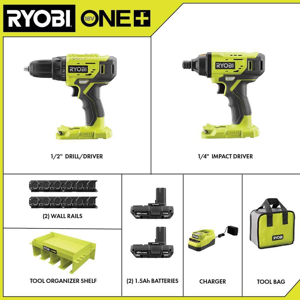 RYOBI ONE+ 18V Cordless 2-Tool Combo Kit w/ Drill/Driver, Impact Driver, Batteries, Charger, LINK Organizer Shelf & Wall Rails