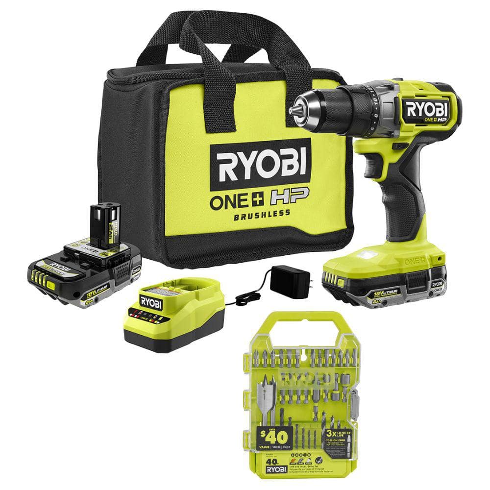 RYOBI ONE+ HP 18V Brushless Cordless 1/2 in. Drill/Driver Kit w/(2) Batteries, Charger, Bag, & Drill/Drive Kit (40-Piece)