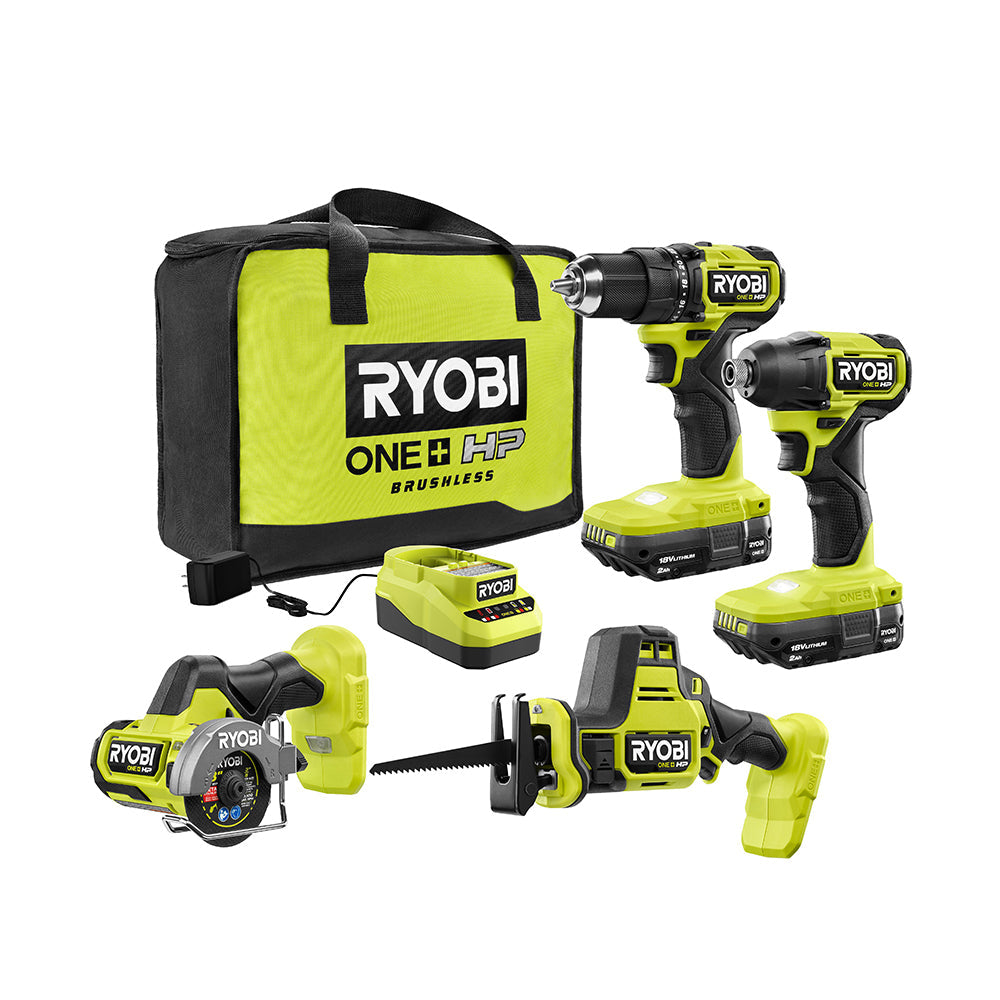 Tackle drilling, driving, cutting, and demolition with this compact ONE+ HP 18V brushless kit. It includes a drill/driver, 1/4 in. impact driver, 3 in. cut-off tool, and one-handed reciprocating saw, plus two 1.5Ah batteries, a charger, and a storage bag—all compatible with the RYOBI ONE+ system.