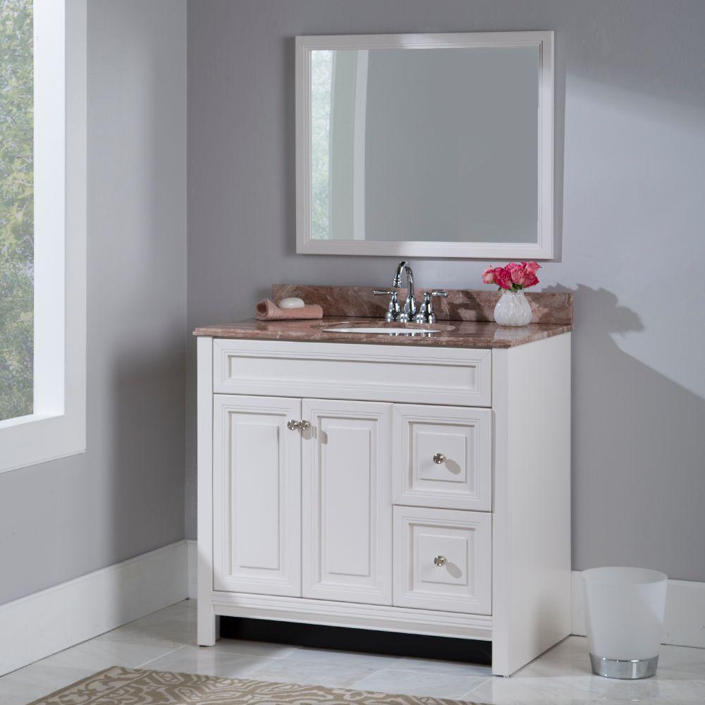 Crafted with quality and detailing, the Brinkhill collection will add charm to your bathroom. This 36 in. vanity features 2 large drawers on full extension drawer glides making it roomy enough for all your bath items. Accented with a furniture toe-kick and a dustgaurd for easy cleaning, the Brinkhill vanity is finished in a beautiful cream color and paired with nickel cabinet hardware.
