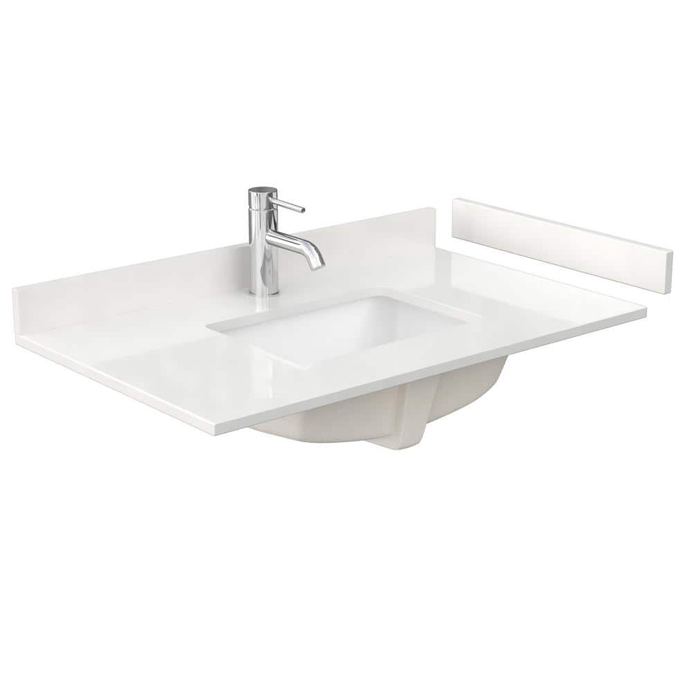 The Wyndham Collection Quartz Vanity Top is a stylish and durable addition to any bathroom. Featuring a white quartz surface, it includes a rectangular undermount porcelain sink and a matching backsplash for a complete look.