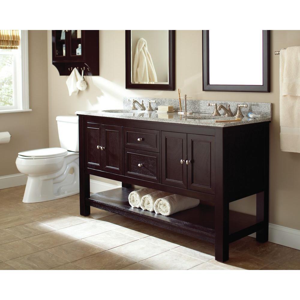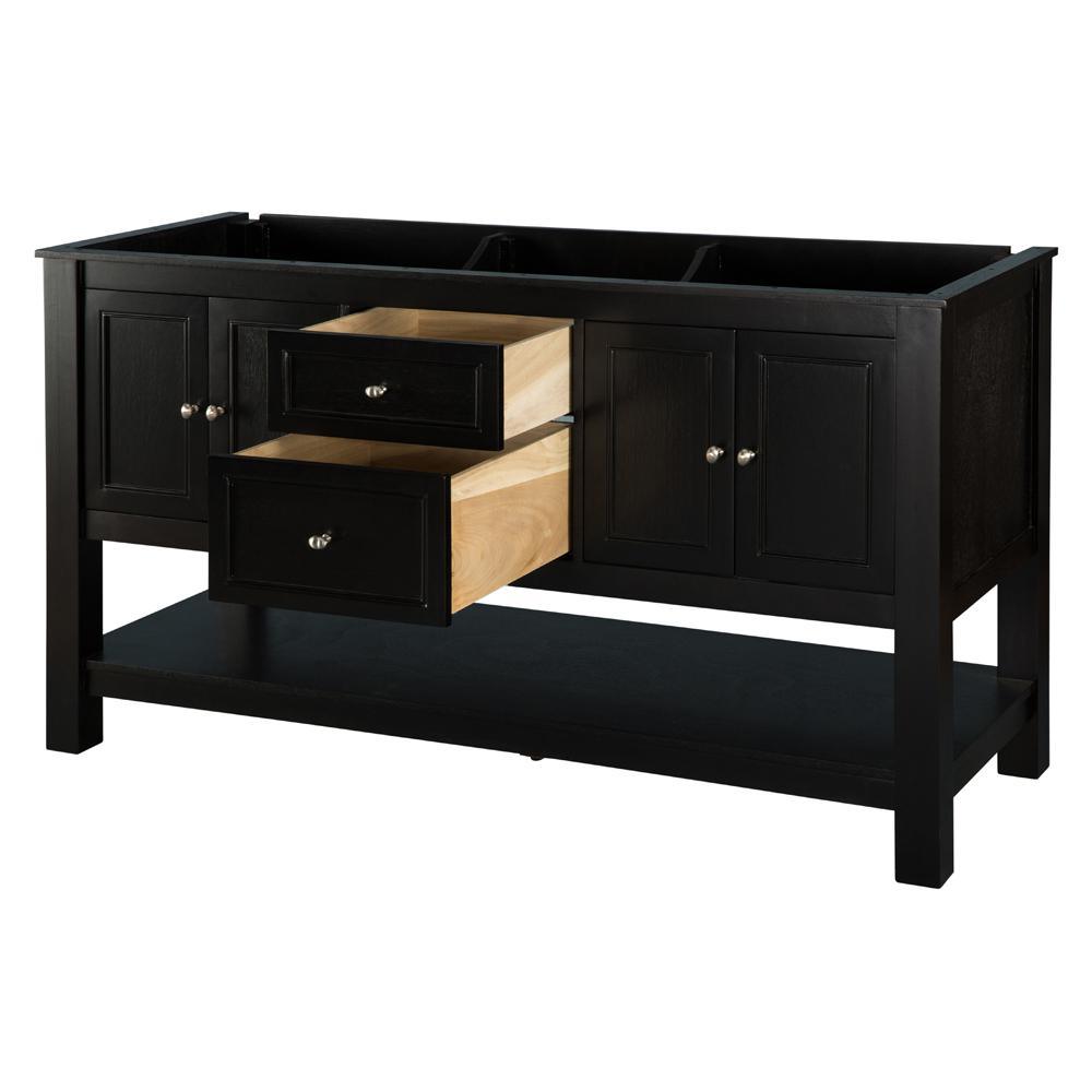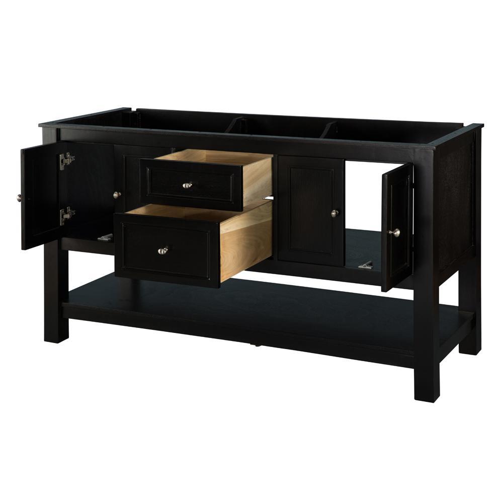This espresso 60 in. vanity cabinet will give your bathroom a modern, upscale look and a warm feel. Solidly built with sturdy components, this piece has adjustable leg levelers that ensure stability should you have uneven flooring. Two middle drawers and two sets of soft-closing inset double doors give way to ample storage for toiletries and essentials, while an open lower shelf offers both a spacious feel and room to stash bath supplies or linens. Its sleek design, dark finish and brushed nickel hardware give this console-style vanity a touch of elegance that homeowners and guests will find welcoming. Enjoy the distinctiveness normally reserved for custom cabinetry at an affordable price with the Foremost Gazette collection.
