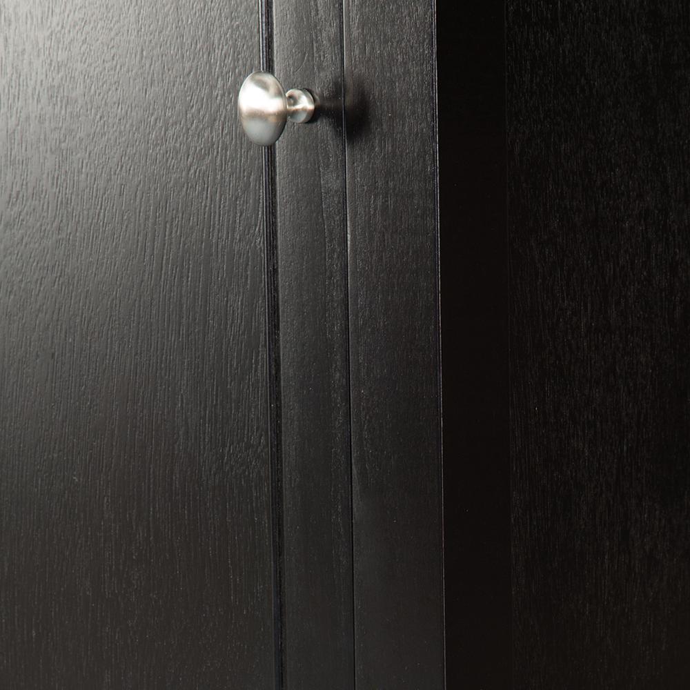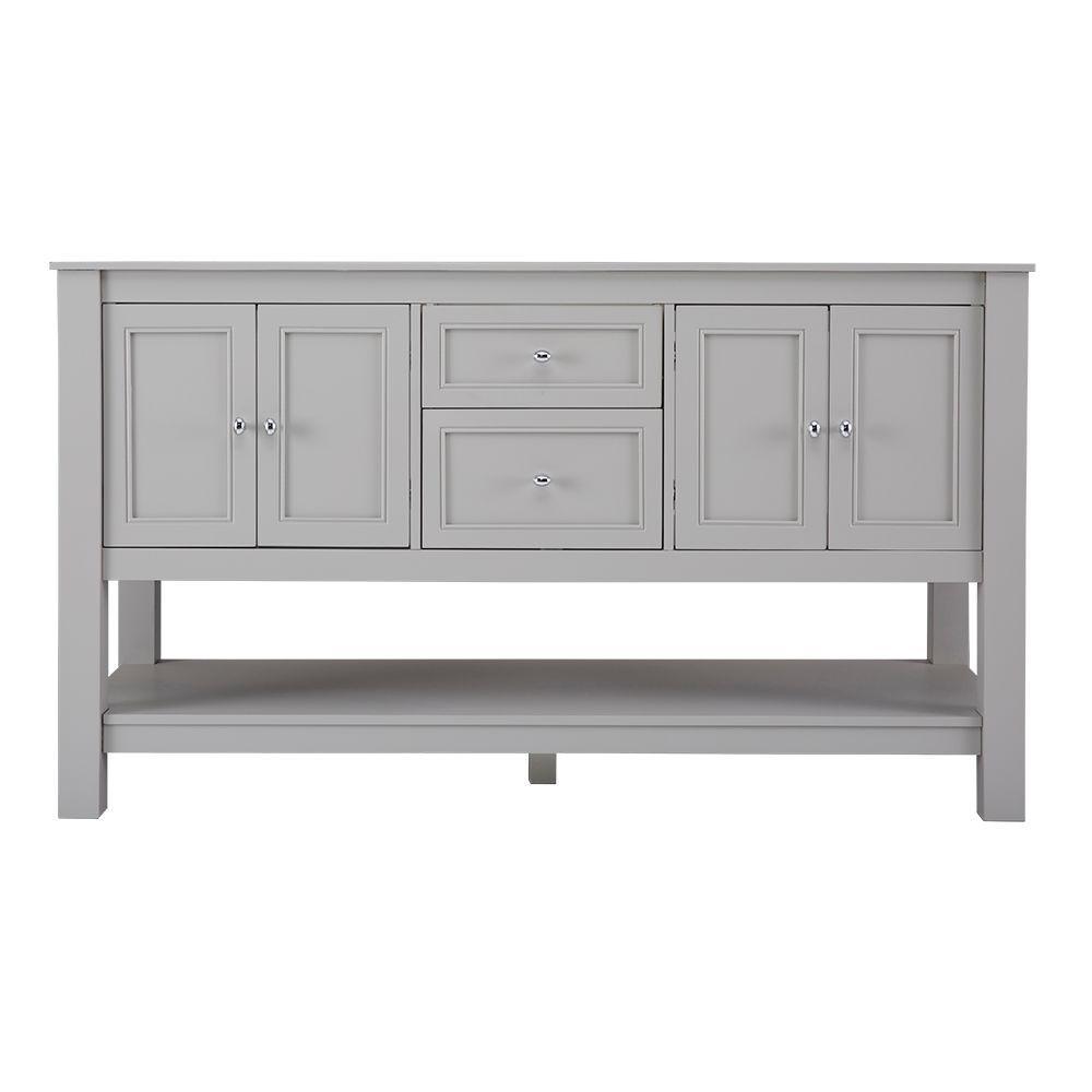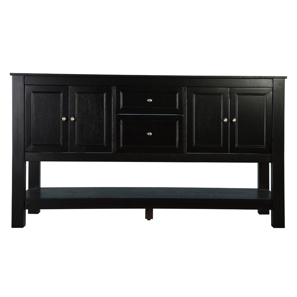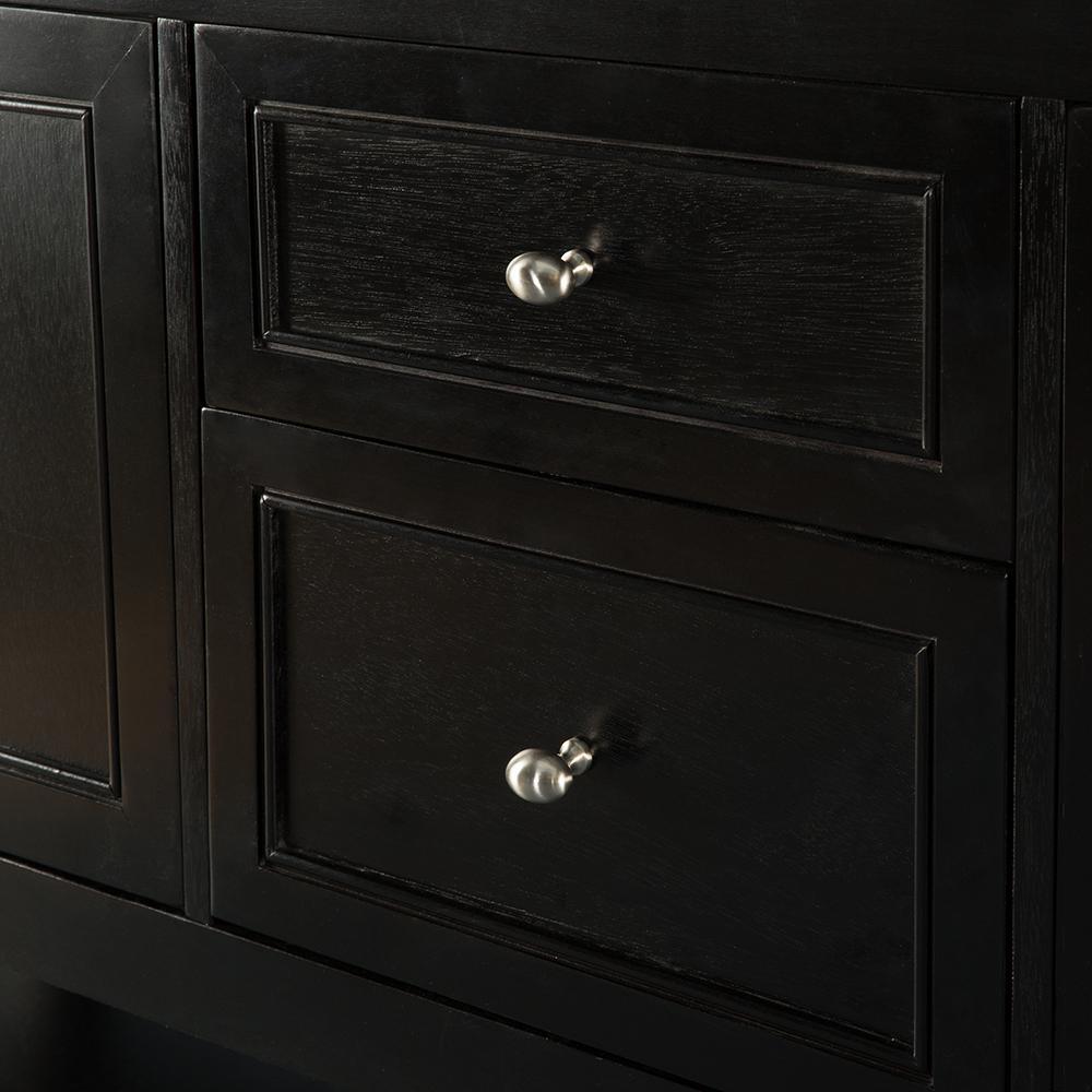 This espresso 60 in. vanity cabinet will give your bathroom a modern, upscale look and a warm feel. Solidly built with sturdy components, this piece has adjustable leg levelers that ensure stability should you have uneven flooring. Two middle drawers and two sets of soft-closing inset double doors give way to ample storage for toiletries and essentials, while an open lower shelf offers both a spacious feel and room to stash bath supplies or linens. Its sleek design, dark finish and brushed nickel hardware give this console-style vanity a touch of elegance that homeowners and guests will find welcoming. Enjoy the distinctiveness normally reserved for custom cabinetry at an affordable price with the Foremost Gazette collection.