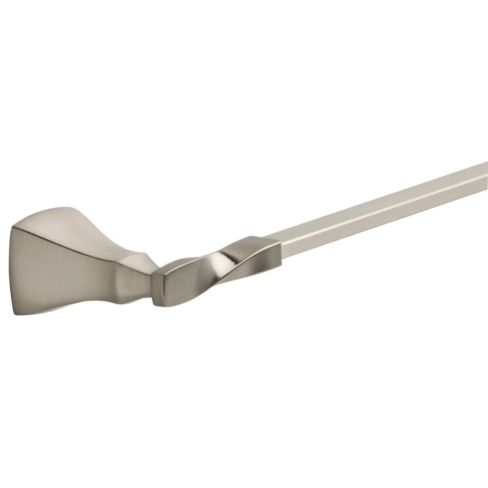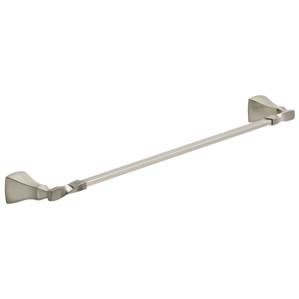 The Delta Sawyer 18-inch towel bar combines architectural lines with a subtle twist detail in a durable satin nickel finish. Made from zinc die-cast with SpotShield technology to resist water spots and fingerprints, it mounts securely to keep towels organized and within reach.