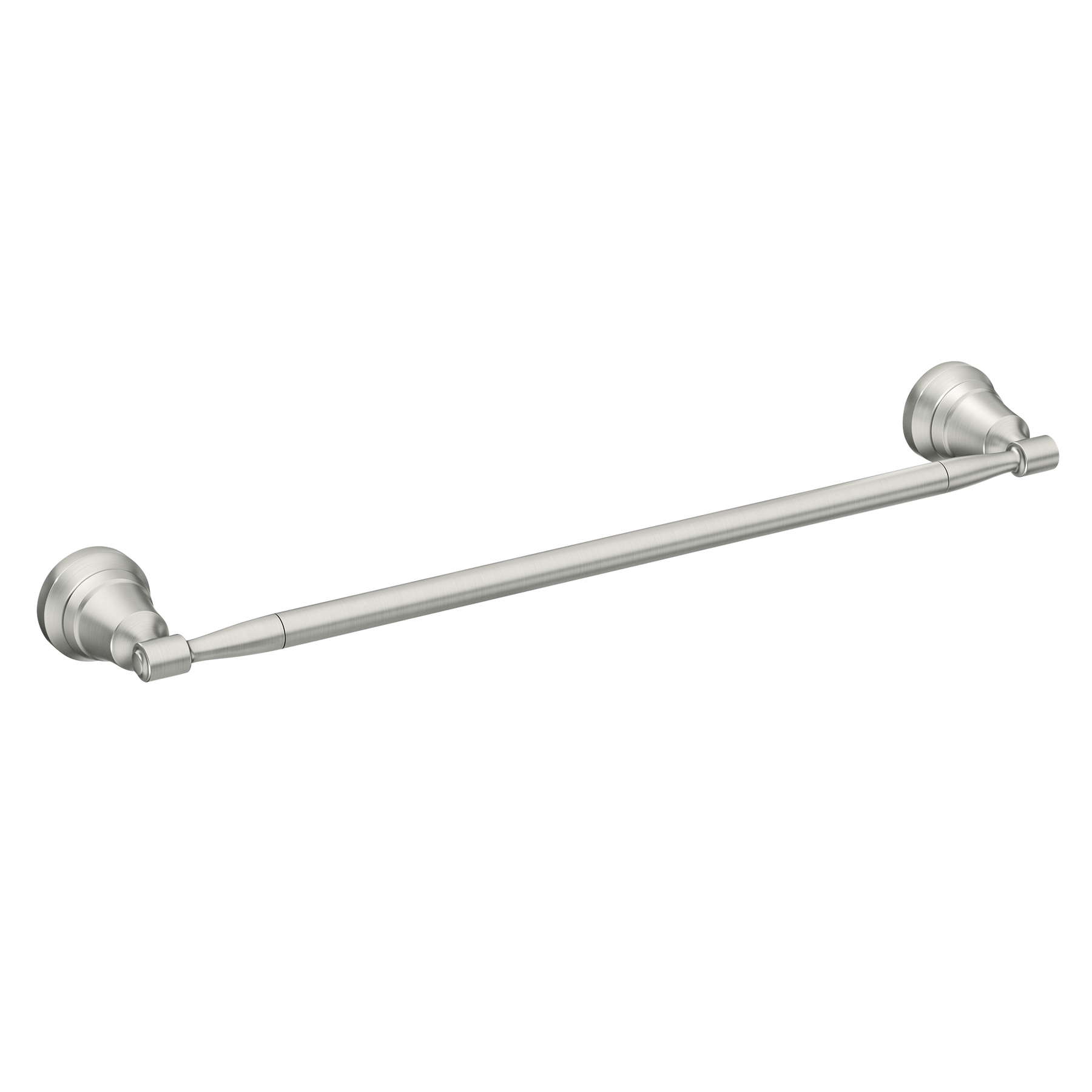 The Moen Halle 18-inch towel bar brings timeless classical lines with contemporary flair to your bath. Finished in Spot Resist Brushed Nickel, it resists fingerprints and water spots for a cleaner look while providing reliable wall-mounted towel storage.