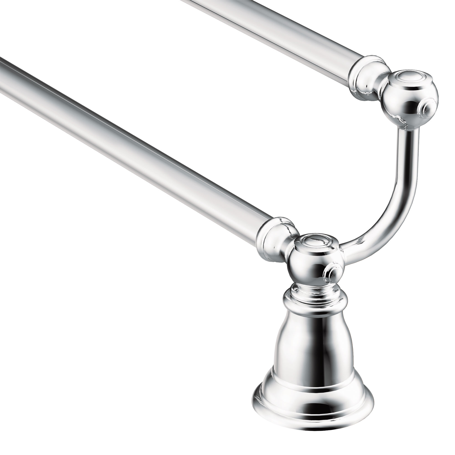 The Moen Kingsley 24-inch double towel bar brings classic elegance and added hanging capacity to your bath. Built with a secure metal mounting post and corrosion-resistant finish, it pairs enduring style with everyday durability.