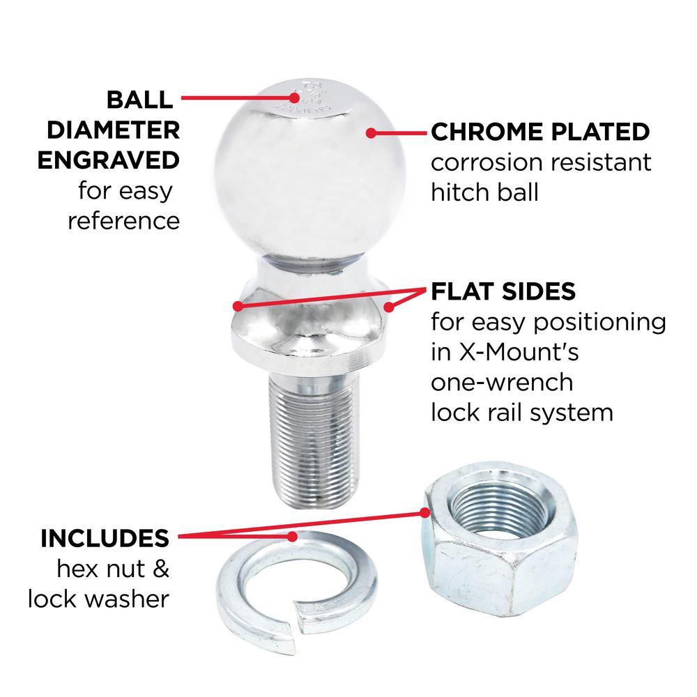 The TowSmart Hitch Ball is a key component to create a secure connection between your vehicle and trailer when towing your valuable assets. The heavy-duty construction is extremely durable with a chrome plated finish that is corrosion resistant. The hitch ball provides wrench flats for easy positioning in the X-Mount lockrail system. The lockrail functions as a built-in wrench preventing hitch ball rotation during installation or removal. The wrench flat design is universal to be used with any standard ball mount. It is important to know the total weight of the trailer (GTW) you are towing and the maximum towing capacity determined by the vehicle manufacturer.
