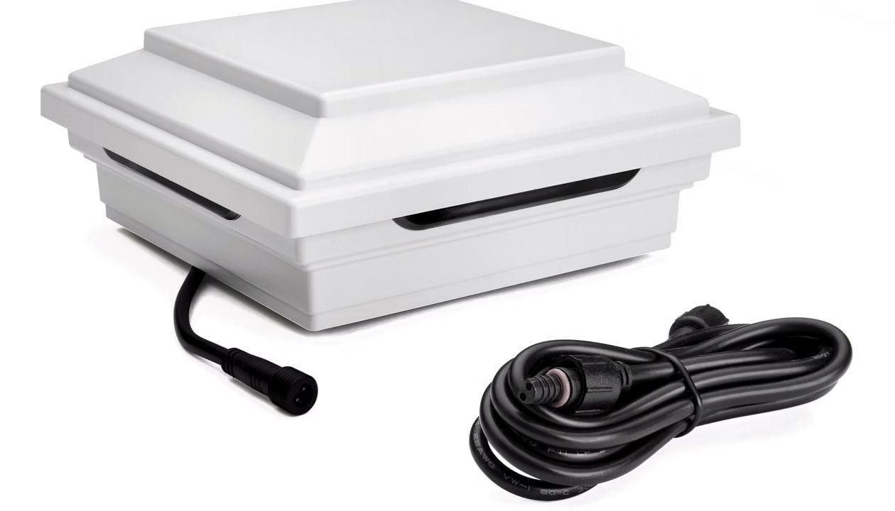 A low-voltage LED post cap designed for Trex 4x4 composite post sleeves, casting a warm, downward glow for safe, ambient deck lighting. Durable polymer housing with polycarbonate lenses integrates with the Trex LightHub system.