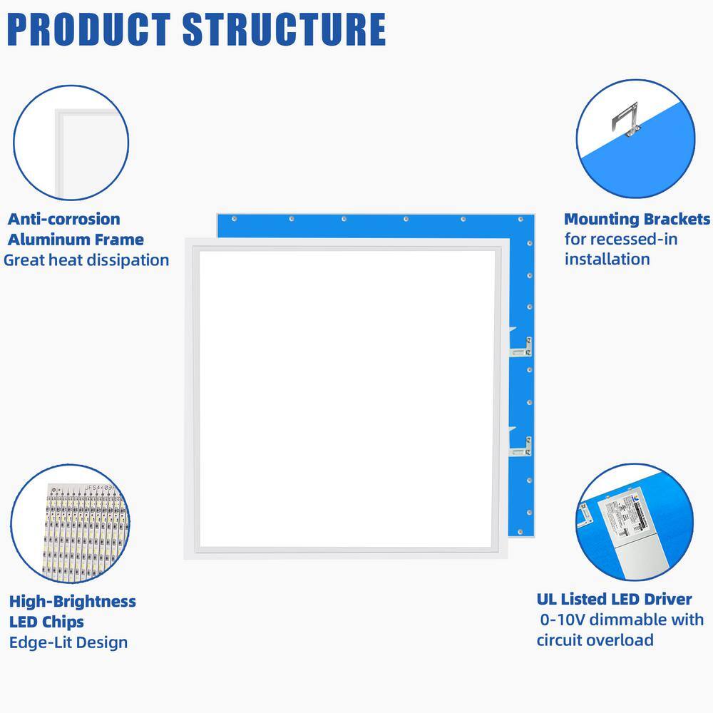 Illuminate your spaces with Bieuoram's 2x2 ft. 5800 Lumens Integrated LED Panel Light, designed to provide bright, energy-efficient lighting. With a 5000K daylight spectrum and dimmable capabilities, these LED panels seamlessly replace fluorescent troffers, reducing maintenance and operating costs while delivering exceptional performance.