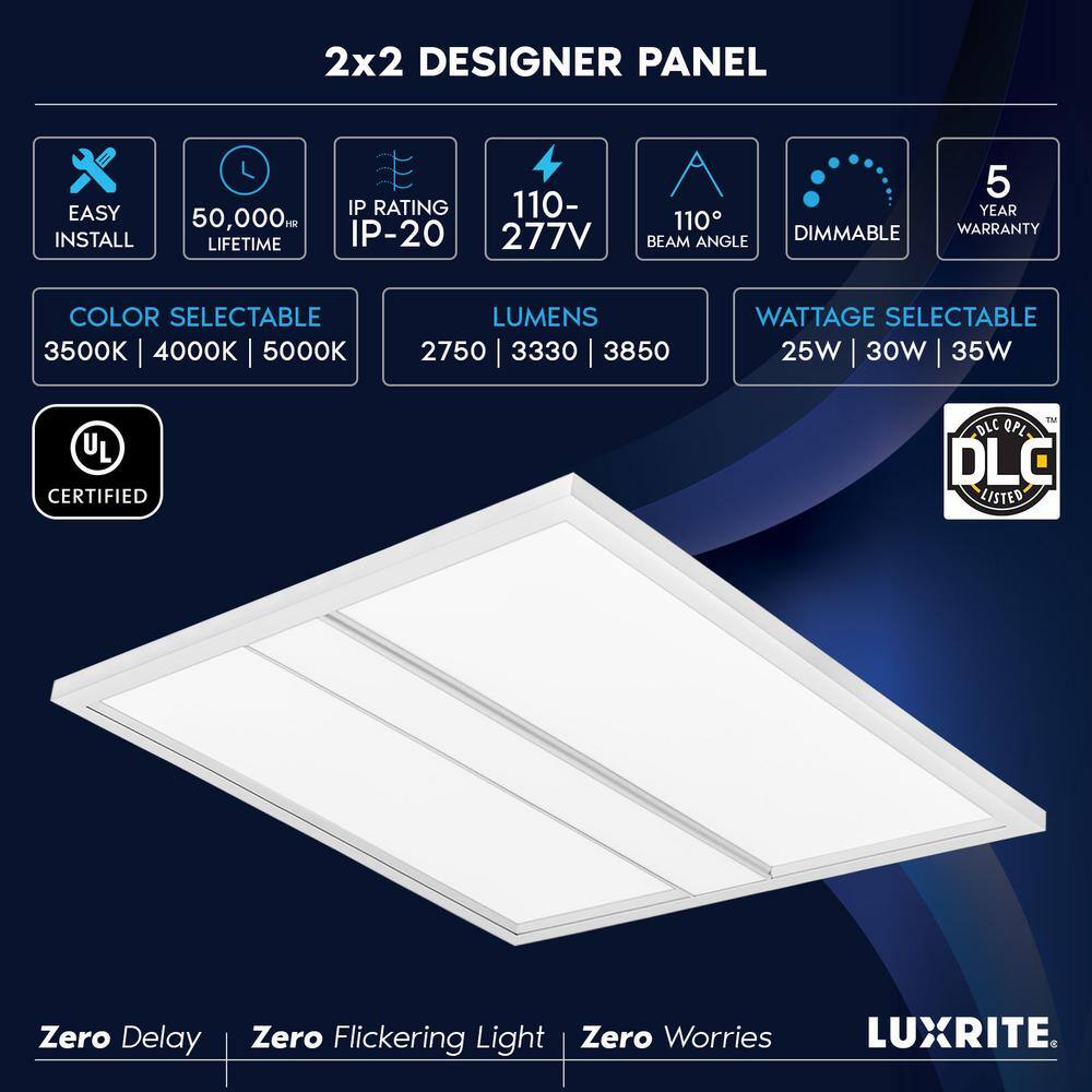 Illuminate your space with the sleek LUXRITE 2x2 ft. Integrated LED Panel Light. Featuring a unique design with a center strip for enhanced ambiance and three color temperature options, this dimmable light offers versatility and style. Ideal for commercial and residential spaces, it provides the perfect blend of functionality and modern aesthetics.