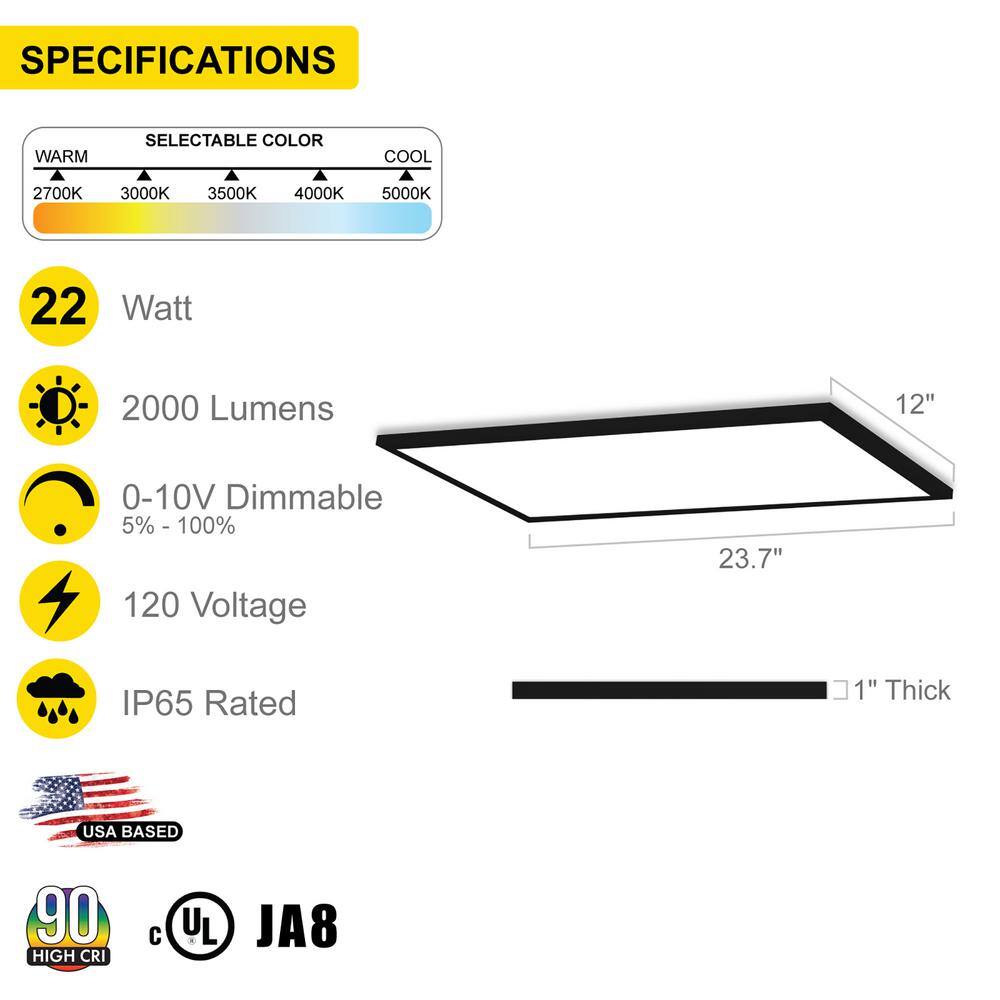 Illuminate your space with NuWatt's 1 ft. x 2 ft. Black Surface Mount Integrated LED Panel. This energy-efficient panel offers adjustable lighting with five selectable color temperatures, superb dimming capabilities, and an impressive lifespan of up to 50,000 hours. Ideal for residential and commercial applications, it's a versatile lighting solution that combines style and performance.