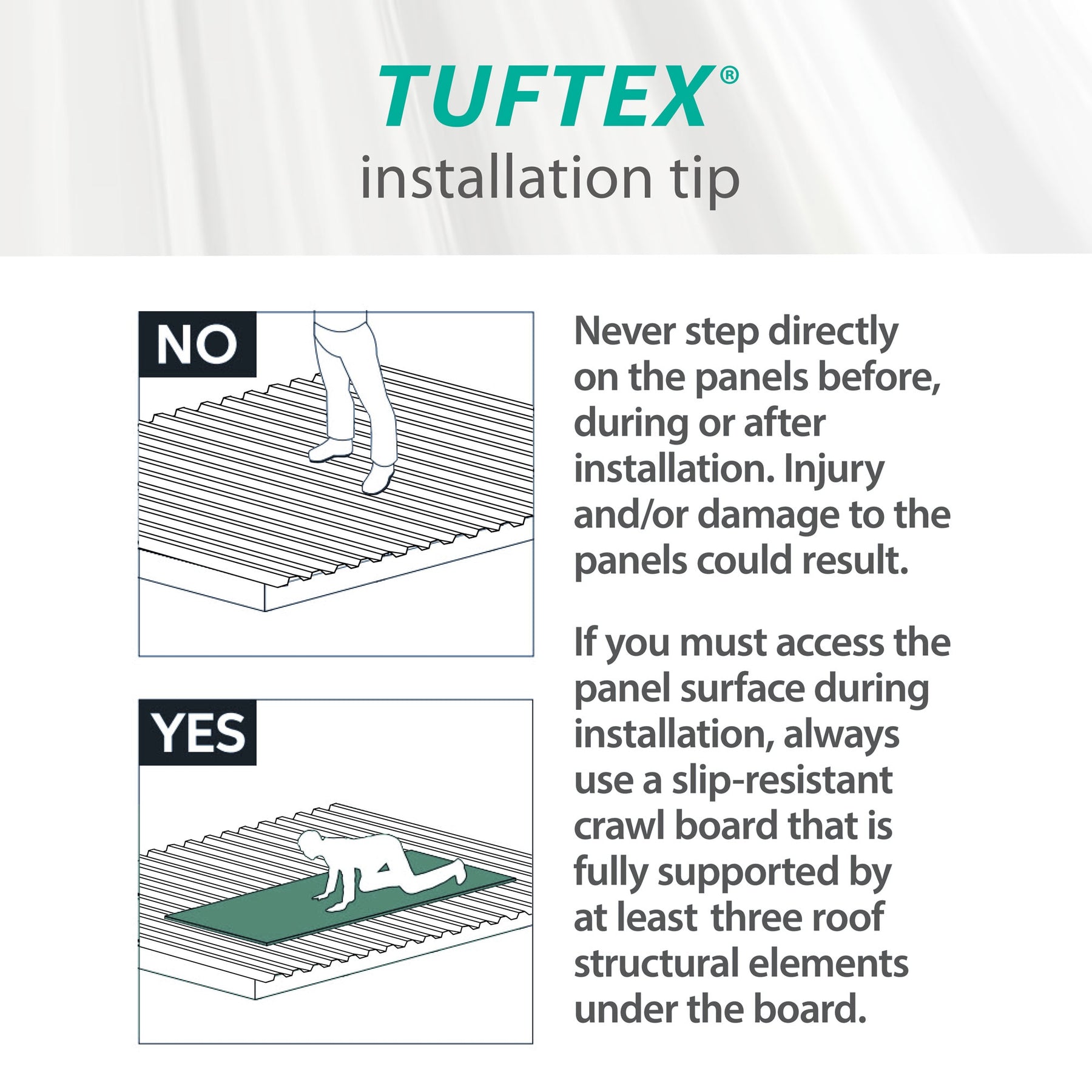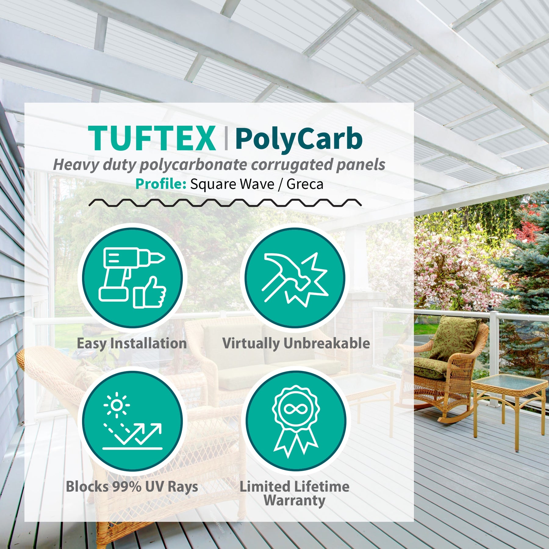Heavy-duty Tuftex PolyCarb corrugated panel provides durable, lightweight roofing for patios, sheds, and greenhouses. The White Opal polycarbonate blocks nearly all UV while withstanding extreme temperatures and impacts. Ideal for bright, diffused light with long-lasting performance.