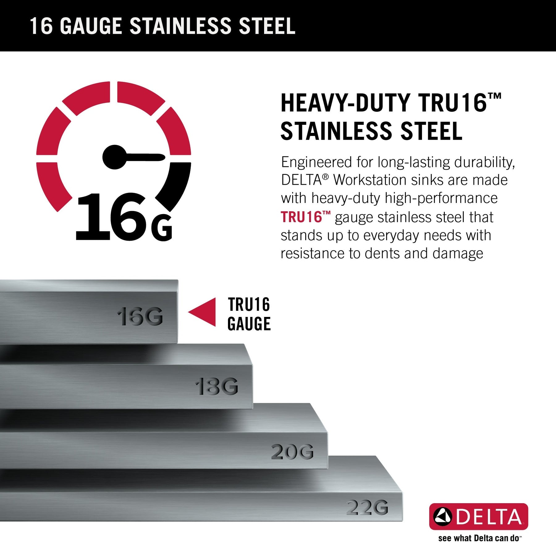 The Delta Undermount Laundry Sink combines functionality and style with its multifunctional WorkFlow Ledge and sleek, durable design. Made from heavy-duty TRU16 gauge stainless steel, this sink is perfect for tackling utility tasks while maintaining a clean, noise-free kitchen or laundry room environment. Its undermount construction allows for seamless integration into countertops, providing a tidy look with easy maintenance.
