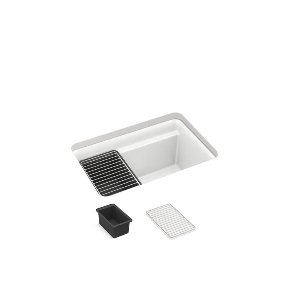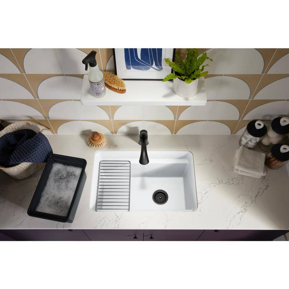 The KOHLER Cairn undermount utility sink style boasts transitional elegance and extreme durability with its Neoroc composite material. It features a richly colored matte white finish that complements any countertop, while the deep bowl design offers ample space for versatile cleaning tasks. Including a stainless steel utility rack and deep wash bin, this sink elevates your kitchen or laundry room functionality.