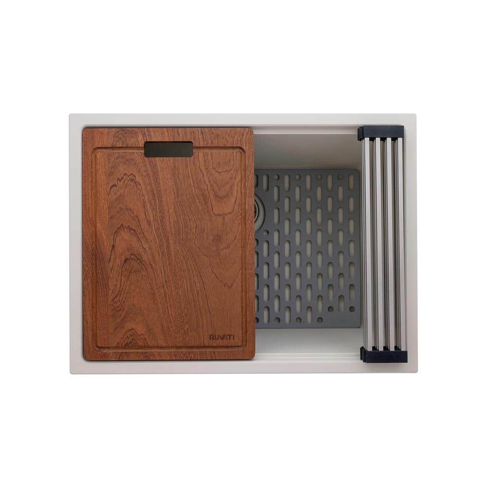 The Ruvati Epirock Undermount Laundry Sink is a versatile and stylish addition to any modern laundry room. Made from durable rock composite, it mimics the look of natural stone while offering robust functionality. Complete with practical accessories like a wooden cutting board and a foldable drying rack, this sink elevates your workspace efficiency.